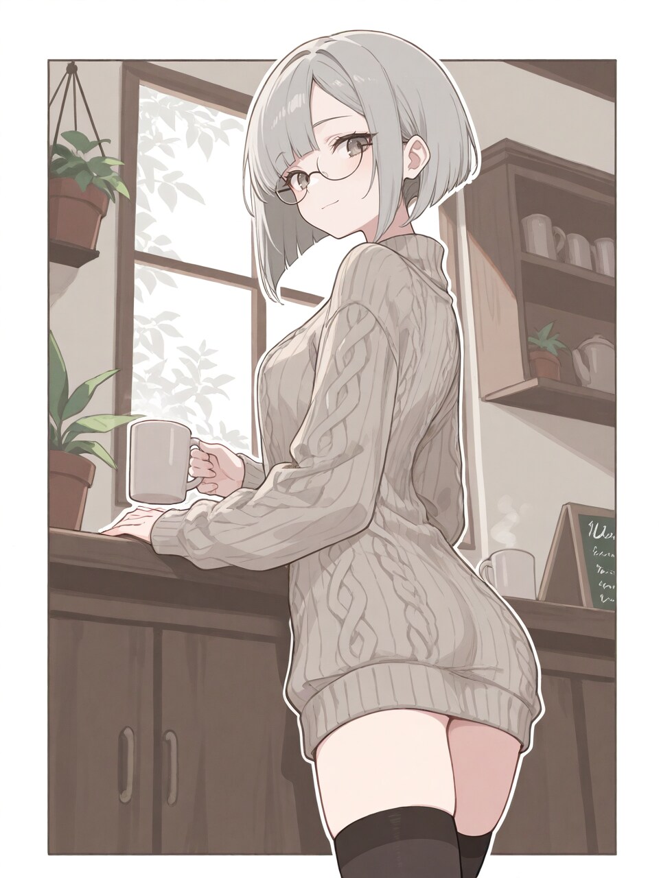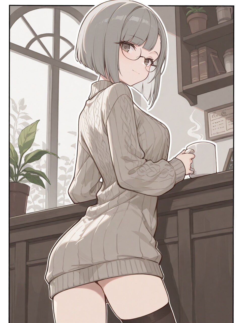 (grey long sweater, sweater dress:1.1), pencil dress, dark thighhighs,