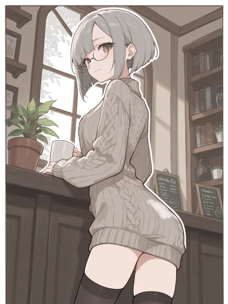 counter, coffee mug, menu board, potted plant, bookshelf, arched window,