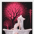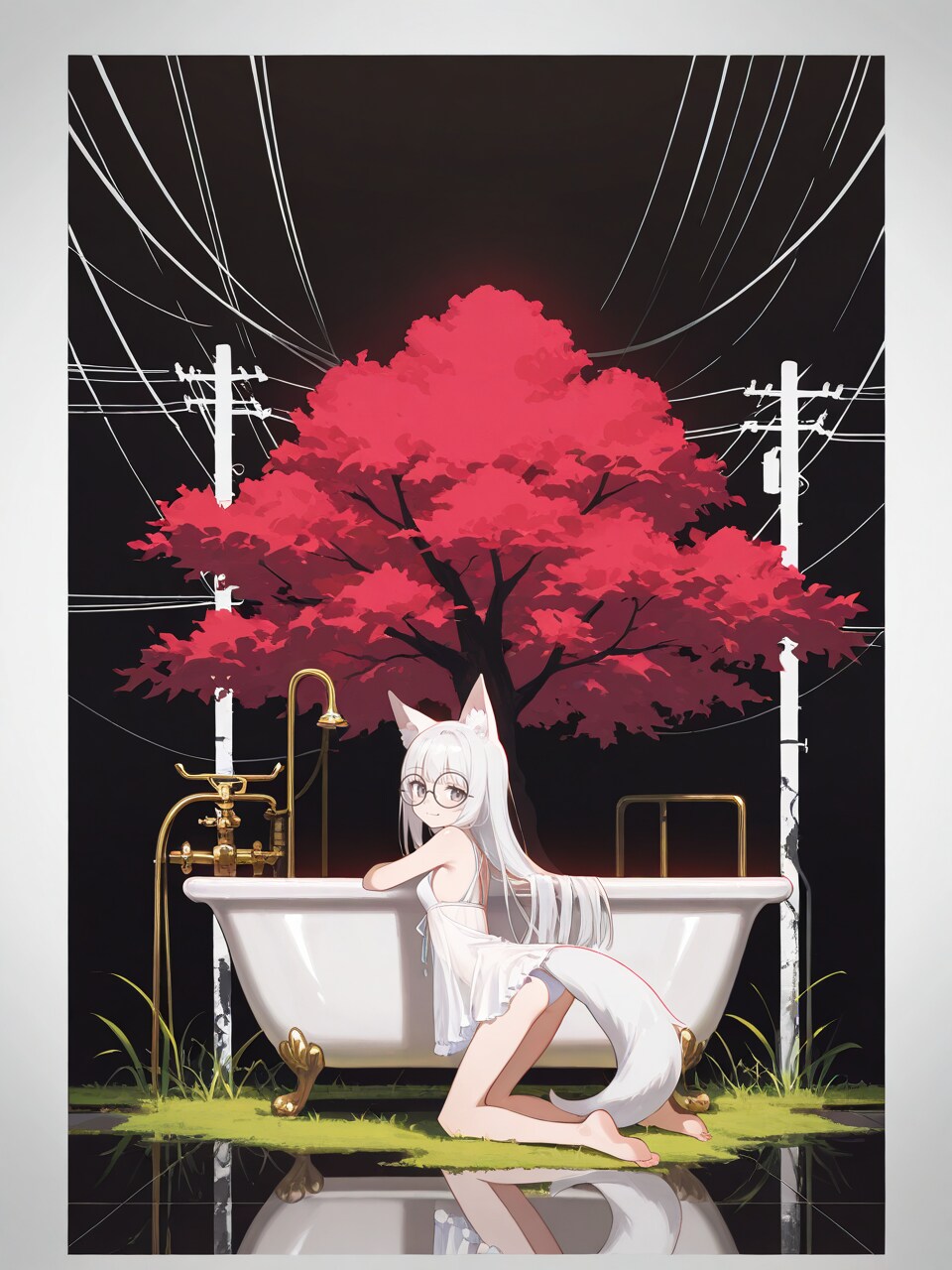 (claw foot bathtub, empty bathtub:0.9), rounded grass ground, (bare tree, pink tree silhouette:0.9), (power lines:1.2),