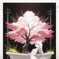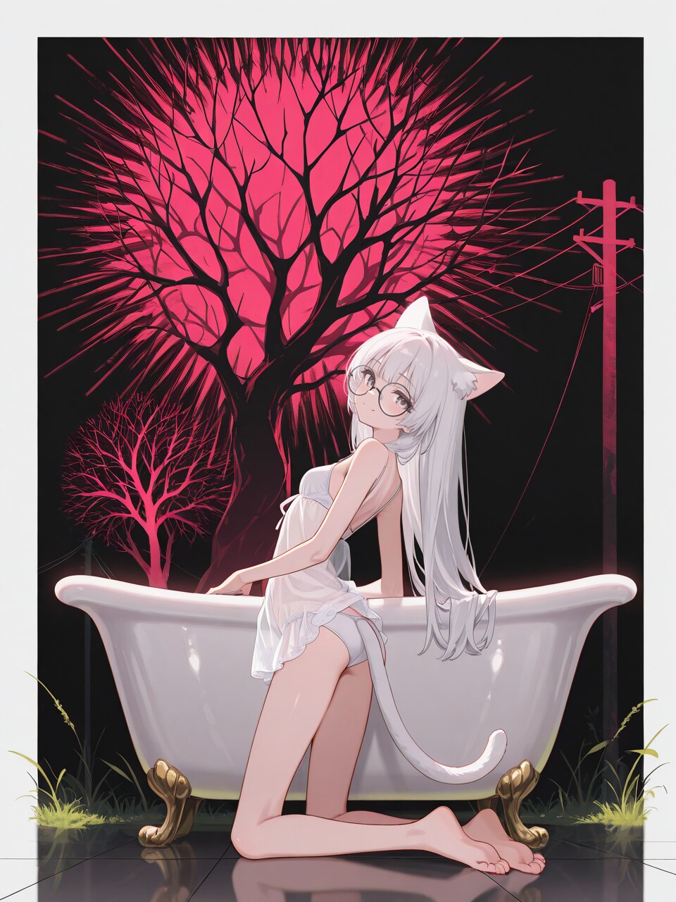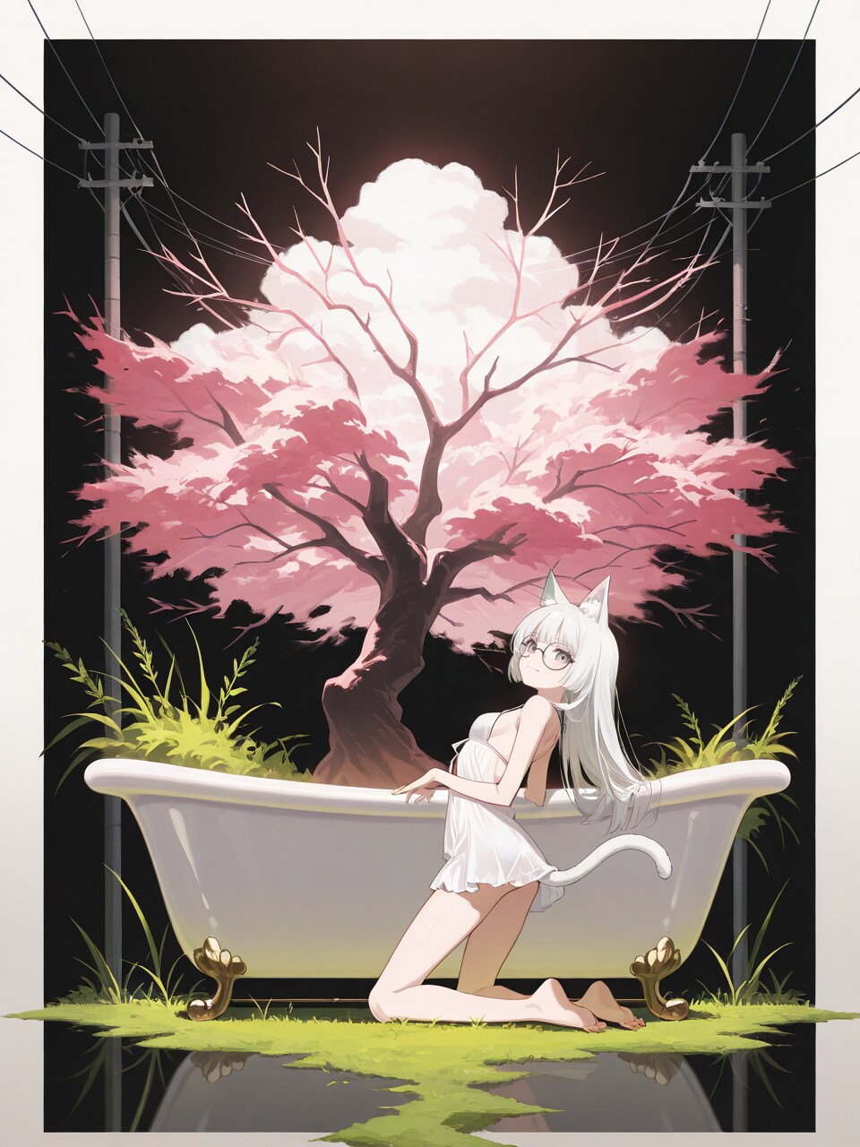 long head, messy hair, thick thighs, bathing, water, fluid, cat, cherry blossoms