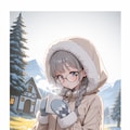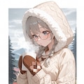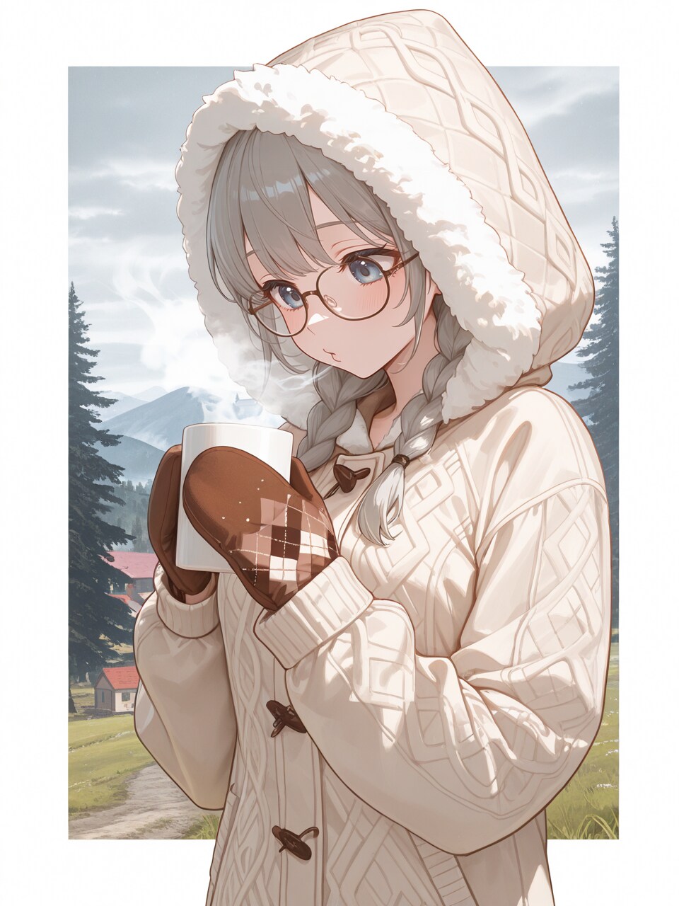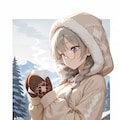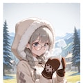 beige hooded jacket, fur-trimmed hood, hood up, mittens,