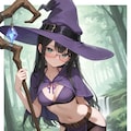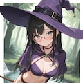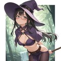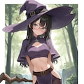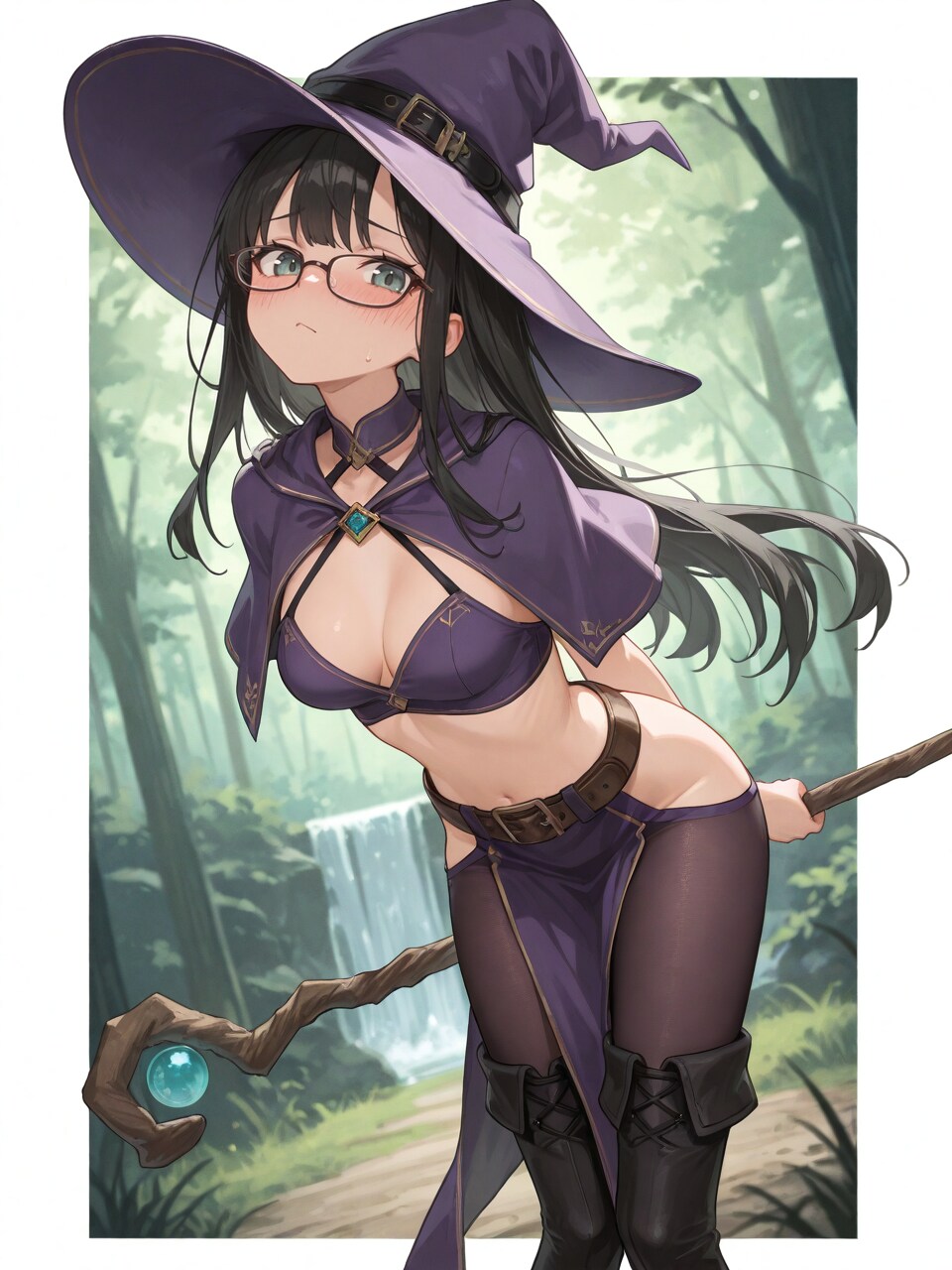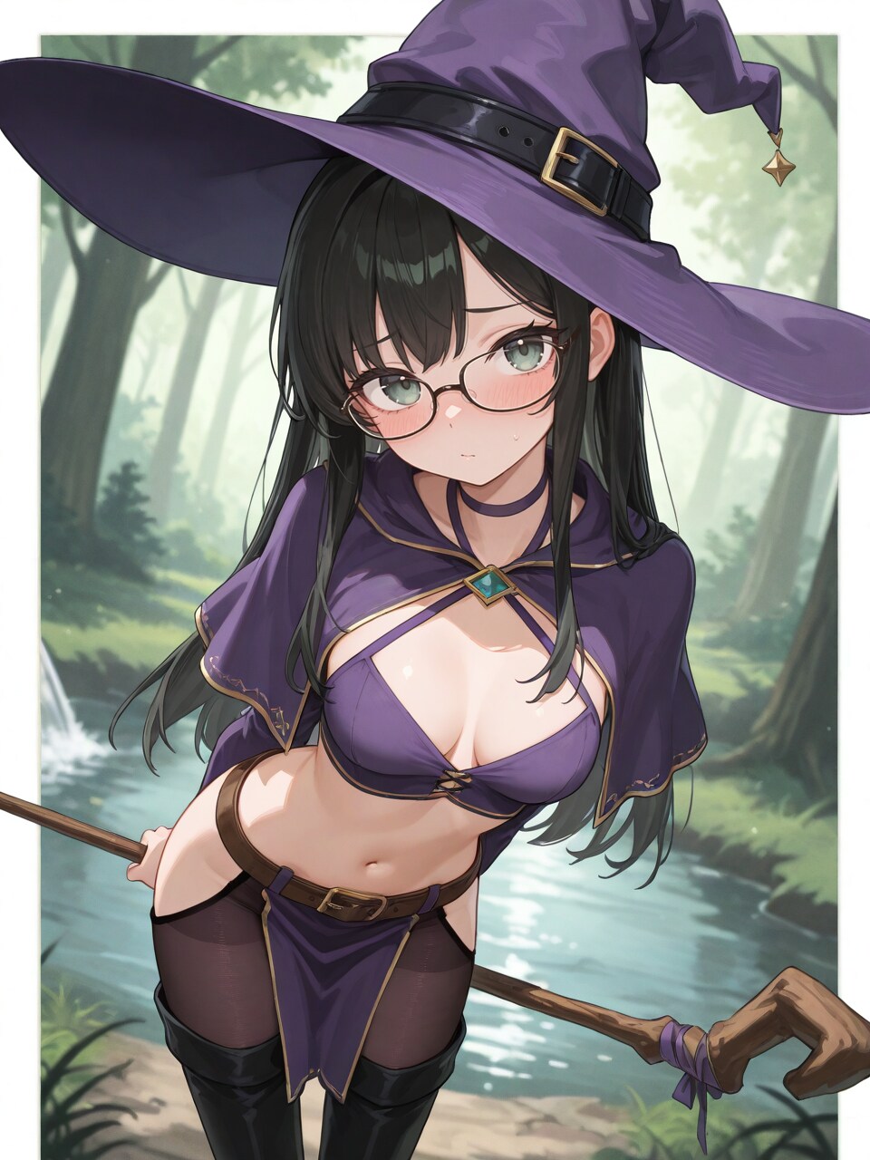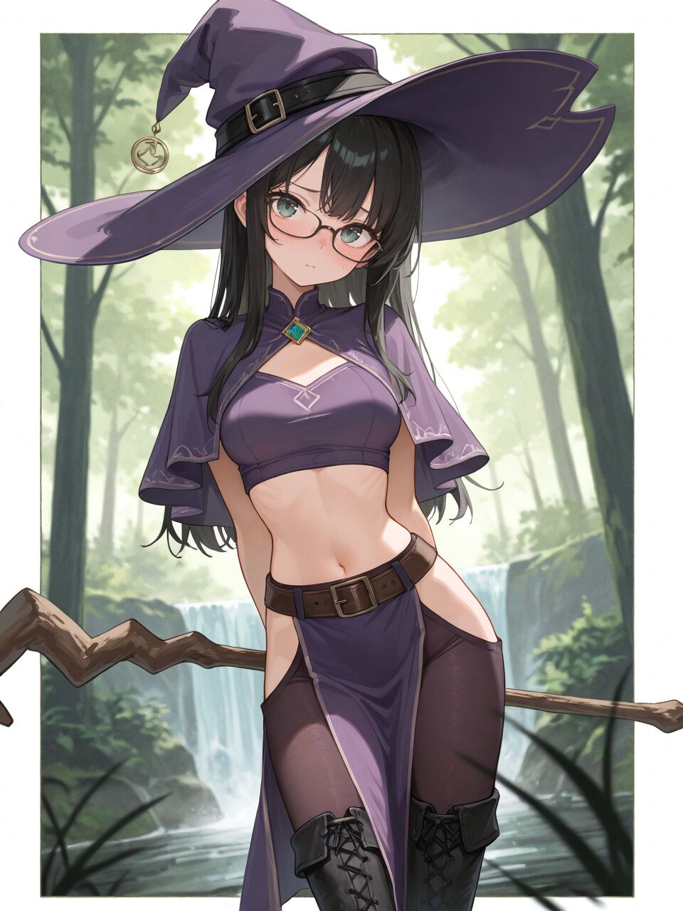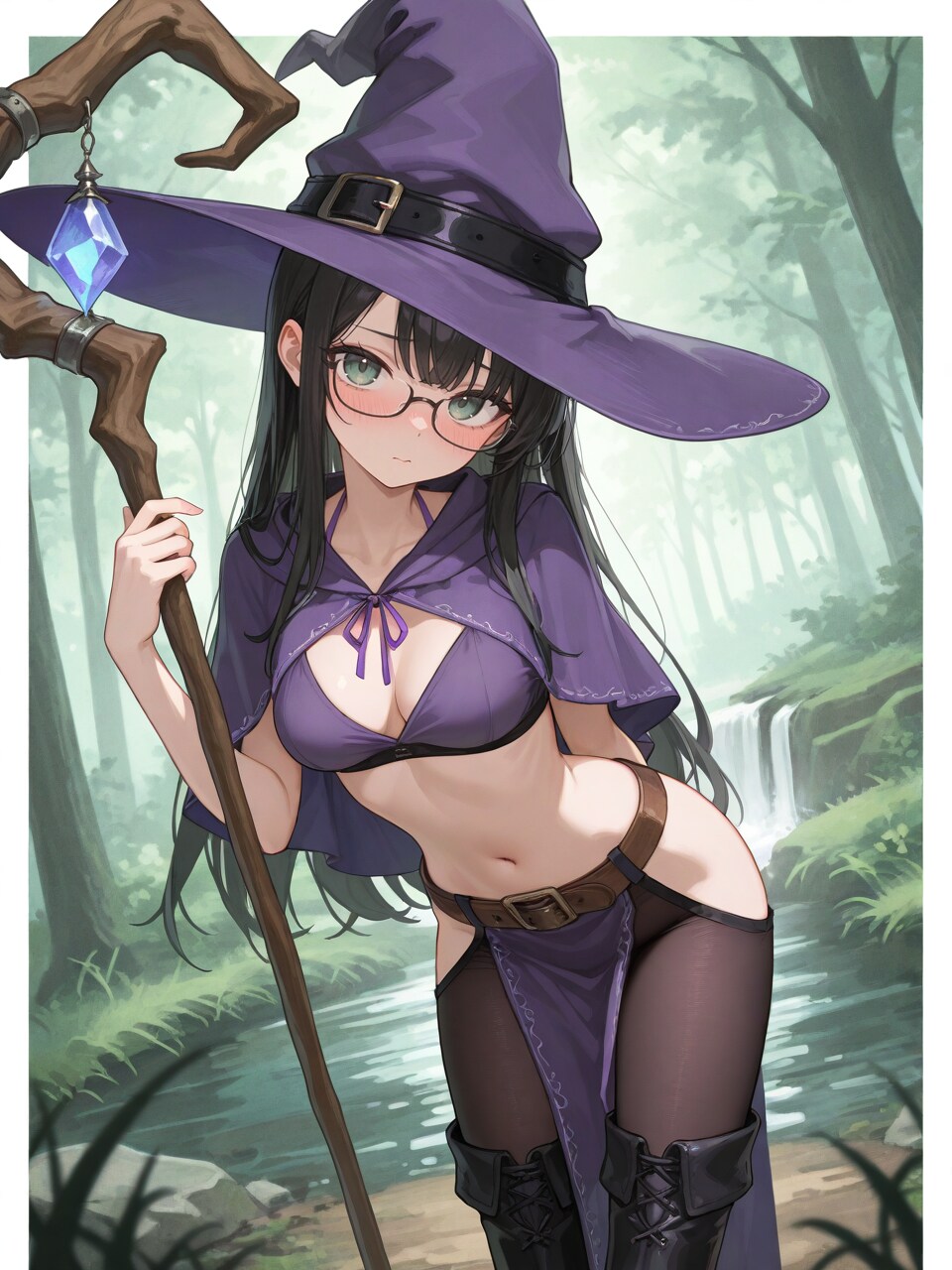 witch hat, (purple halterneck:1.1), midriff, purple pelvic curtain, (dark pantyhose:1.1), black thigh boots,