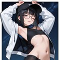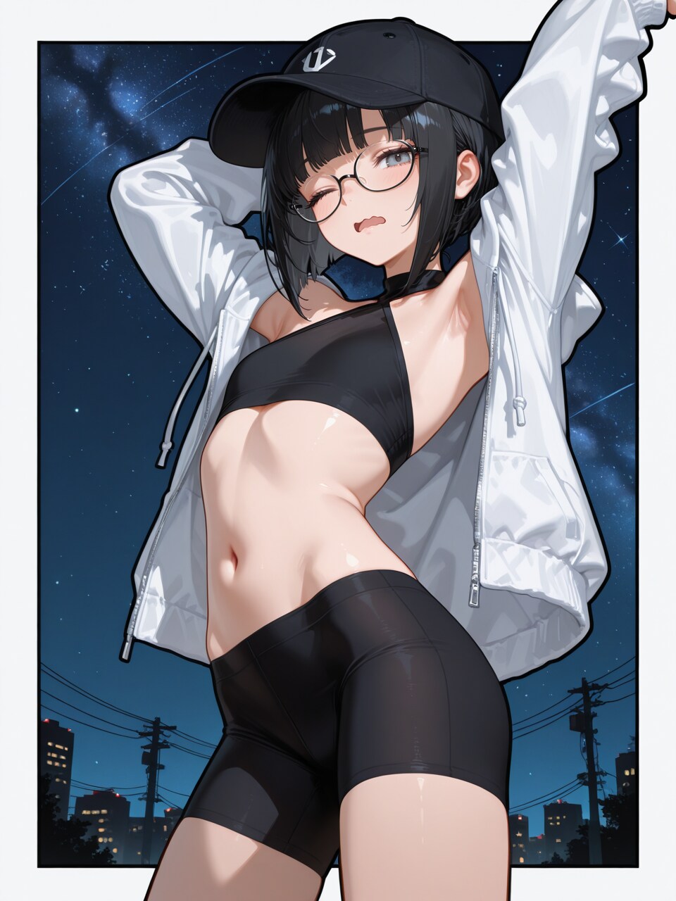 black hair, inverted bob, black baseball cap,