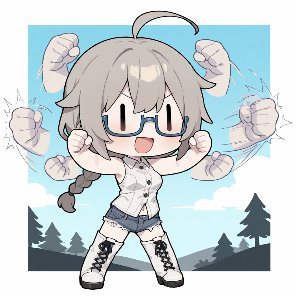 medium breasts, navel peek, narrow waist, (extra arms:0.8), (legs apart:0.9), clenched hands,