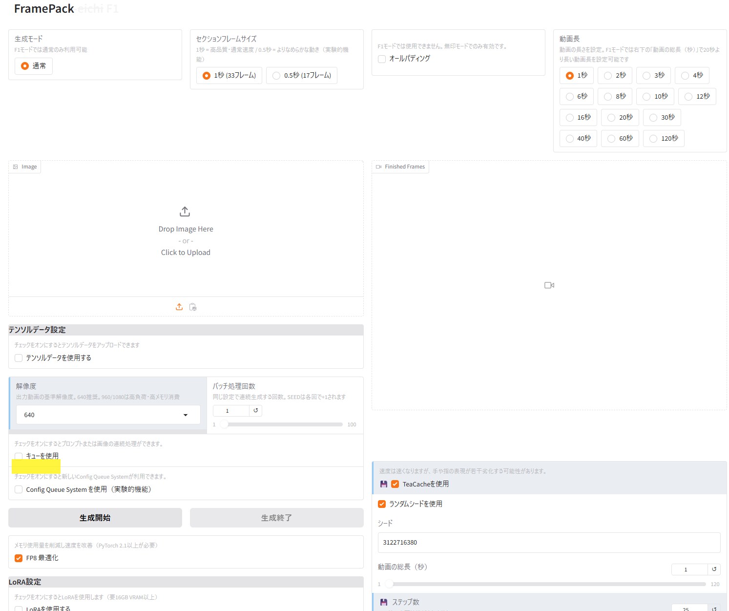 2枚目の画像がFramePack-eichiの画面ですが、その中に「キューを使用」というチェックボックスがあるのでそれをオンにしてみます。