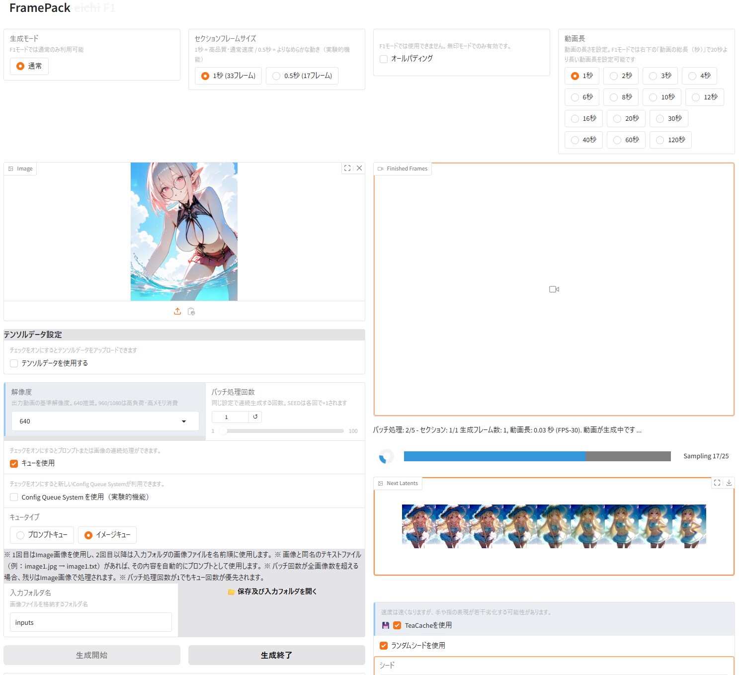 最初にFramePackのUI上の画像をもとに動画が生成された後、次にキューにセットした画像の、ファイル名順に動画生成していくようです。(7枚目)