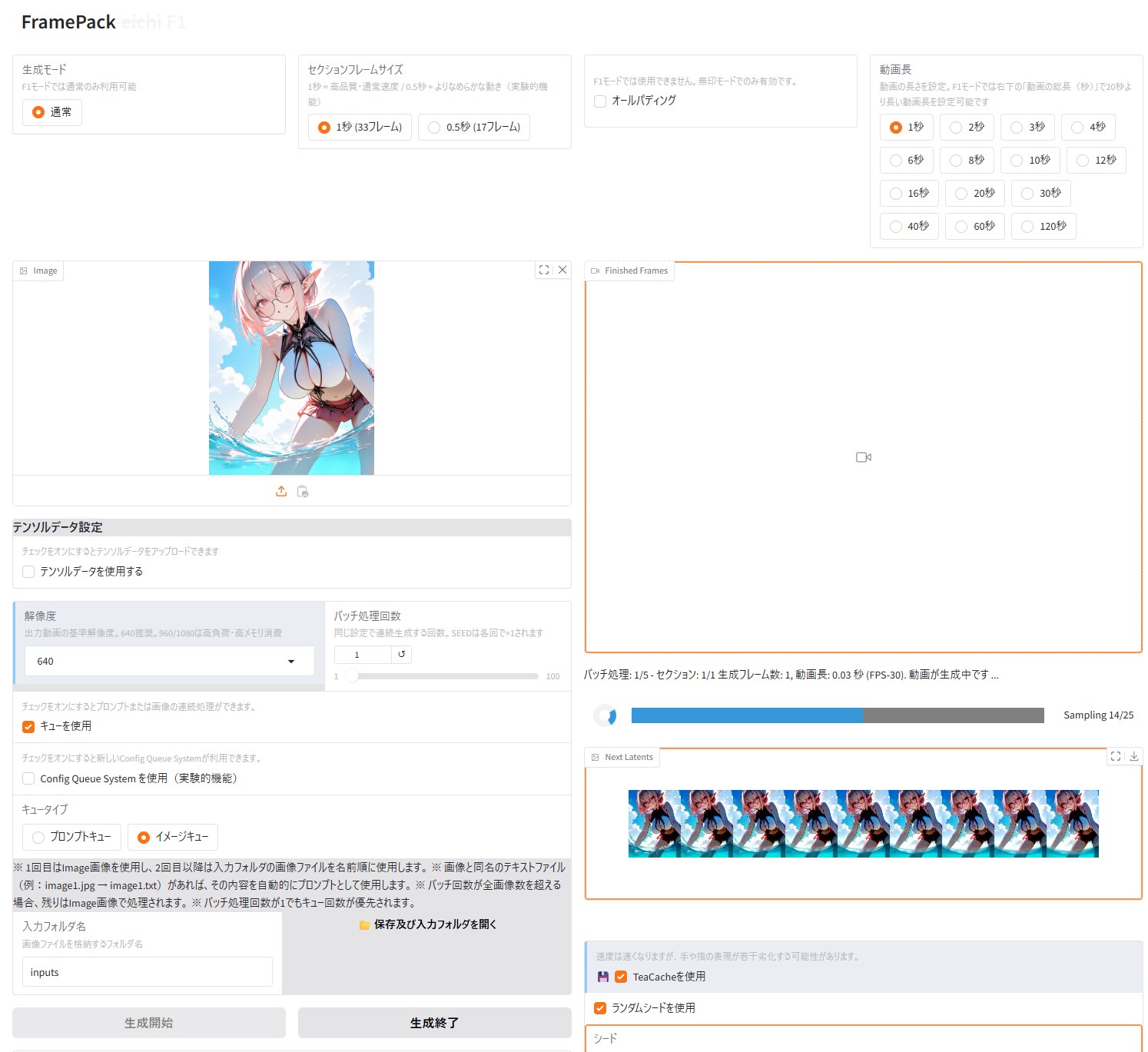 こうしておいて、「生成開始」ボタンを押せばキューにセットした画像から動画が…ということなのですが、実は6枚目の画像のように、キューにセットした画像とは別に、もう1枚、FramePackのUI上で元画像を指定しておく必要があります。(今回はMuaccaさんの水着画像をセットしておきました)