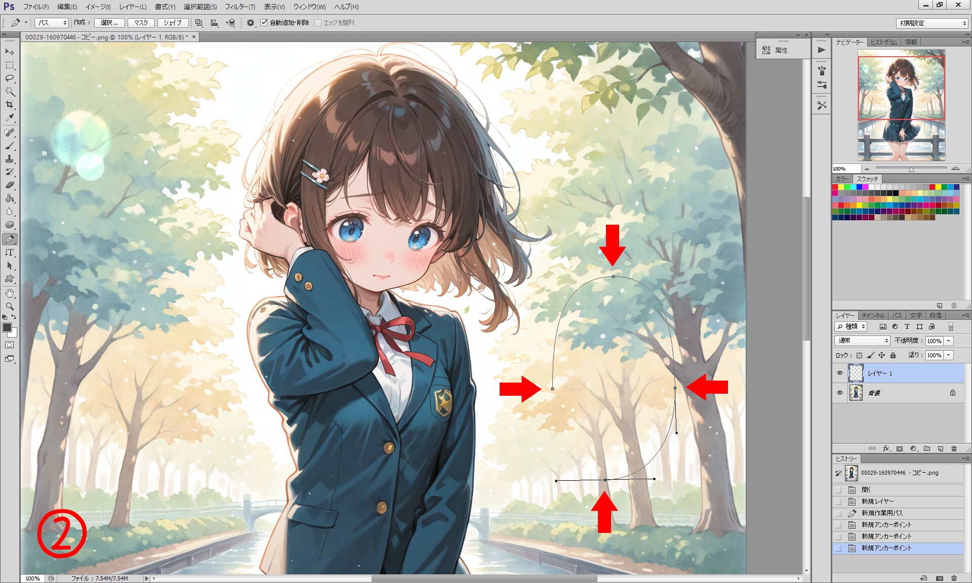 ②新規レイヤーでパスツールを使い、左上右下の順にアンカーポイントを打って縦長の楕円を作ります