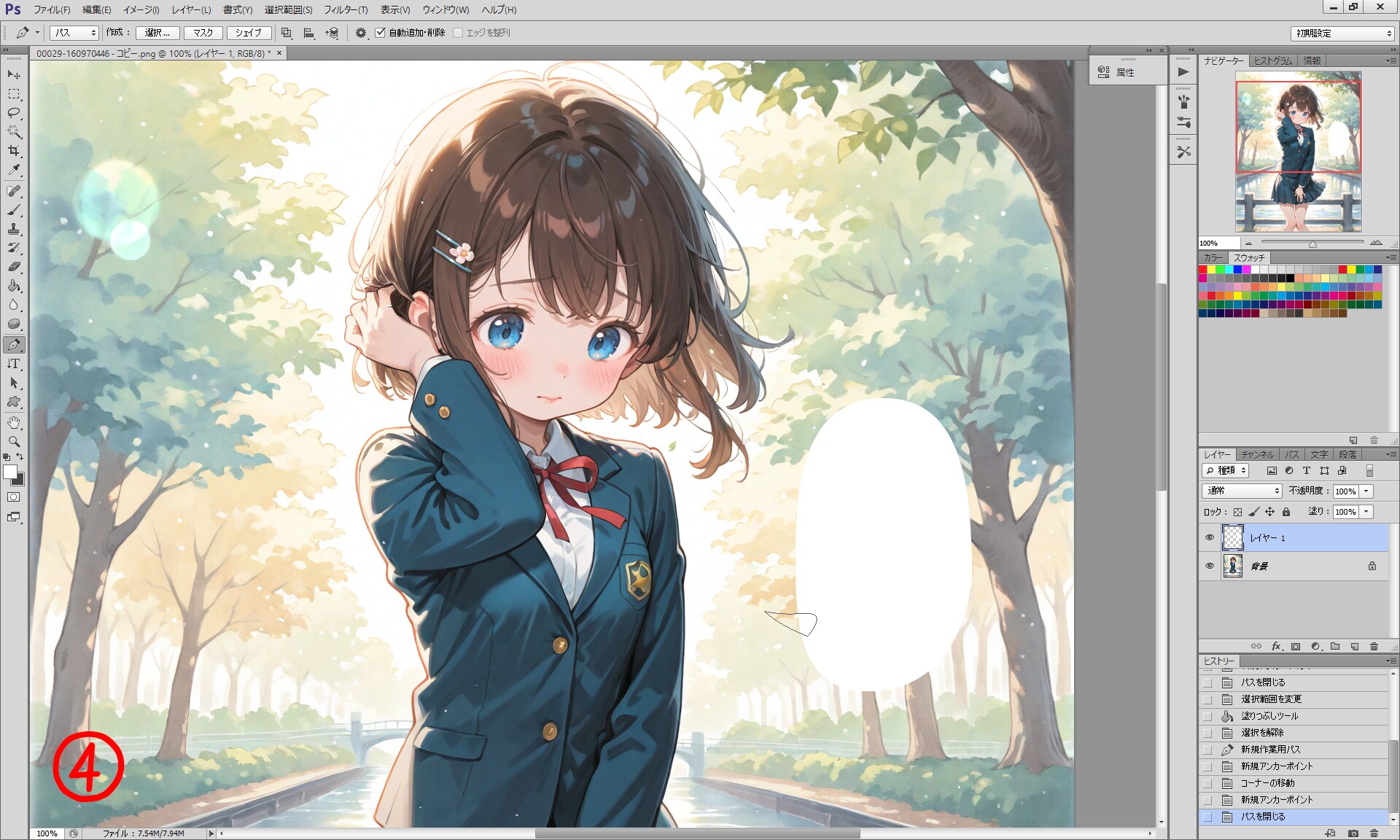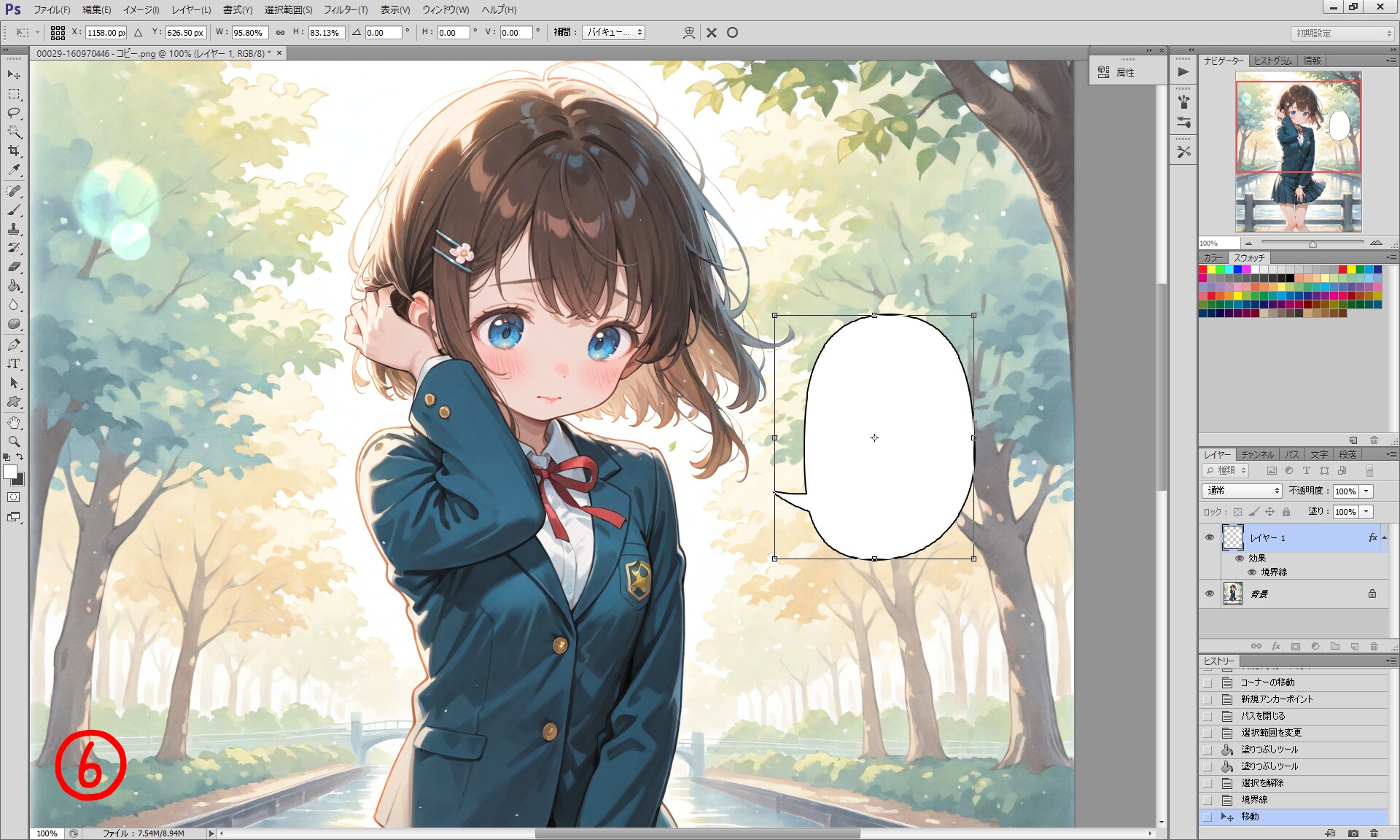 【制作過程】吹き出しの付け方2 ✅Photoshopのパスツールを使って吹き出しを作る ※ベジェ曲線は初めてだと難しいので描き方の動画などを参照してください ①吹き出しが無い元絵 →右側に吹き出しを作ります ②新規レイヤーでパスツールを使い、左上右下の順にアンカーポイントを打って縦長の楕円を作ります →多少形が歪むように作るとそれっぽく見えます ③丸く作ったらパスを選択範囲として読み込みます ④選択範囲内を白で塗りつぶし、もう1度パスツールを使ってしっぽを作ります(※しっぽ=吹き出しの尖っている部分 →しっぽも同じように選択範囲に変換して塗りつぶします 吹き出し本体と重なっている部分は適当な形でokです ⑤レイヤー効果の『境界線』を使って吹き出しの縁に色を付けます ⑥自由変形ツールで形を整えます ⑦セリフを入れます ⑧不透明度を下げて背景を透かします →これは絵に合わせてやったりやらなかったりします *完成* 💡【ポイント】 ・最初にパスツールで作る形は後で自由変形ツールで修正するのでだいたいの形でok ・Photoshopが無ければGIMPなどでも出来る・・・かも?(※GIMPは未使用なので詳細は不明 # Model: shiitakeMix v2.0 by Vsukiyaki