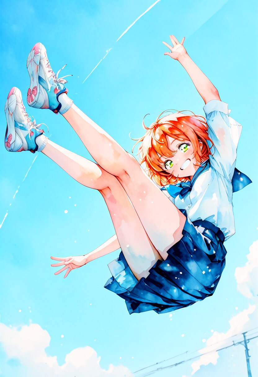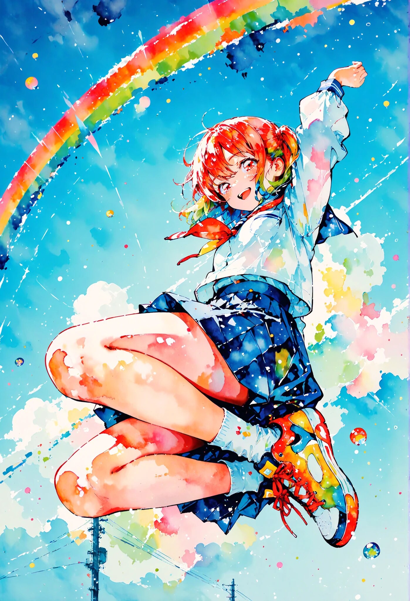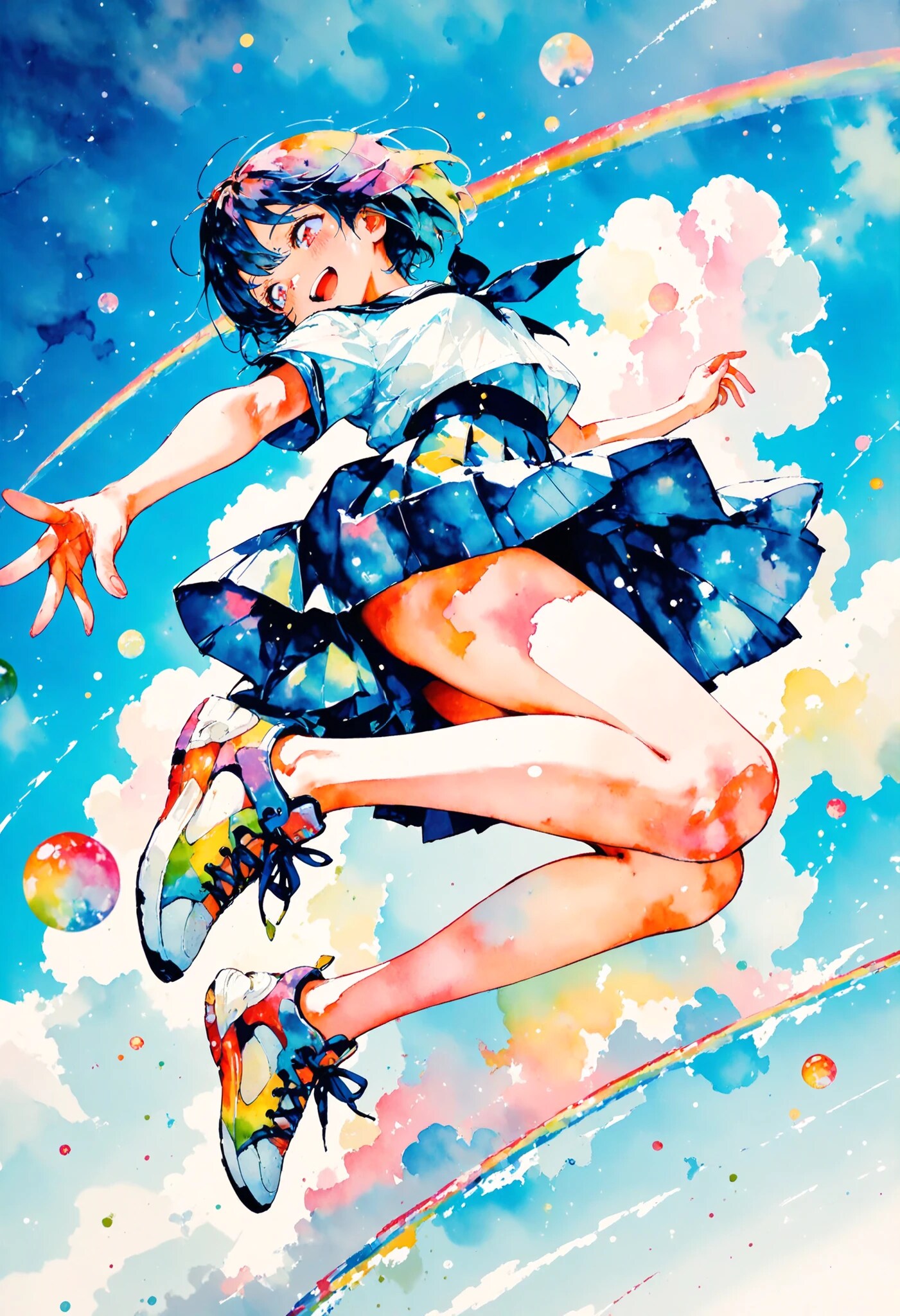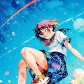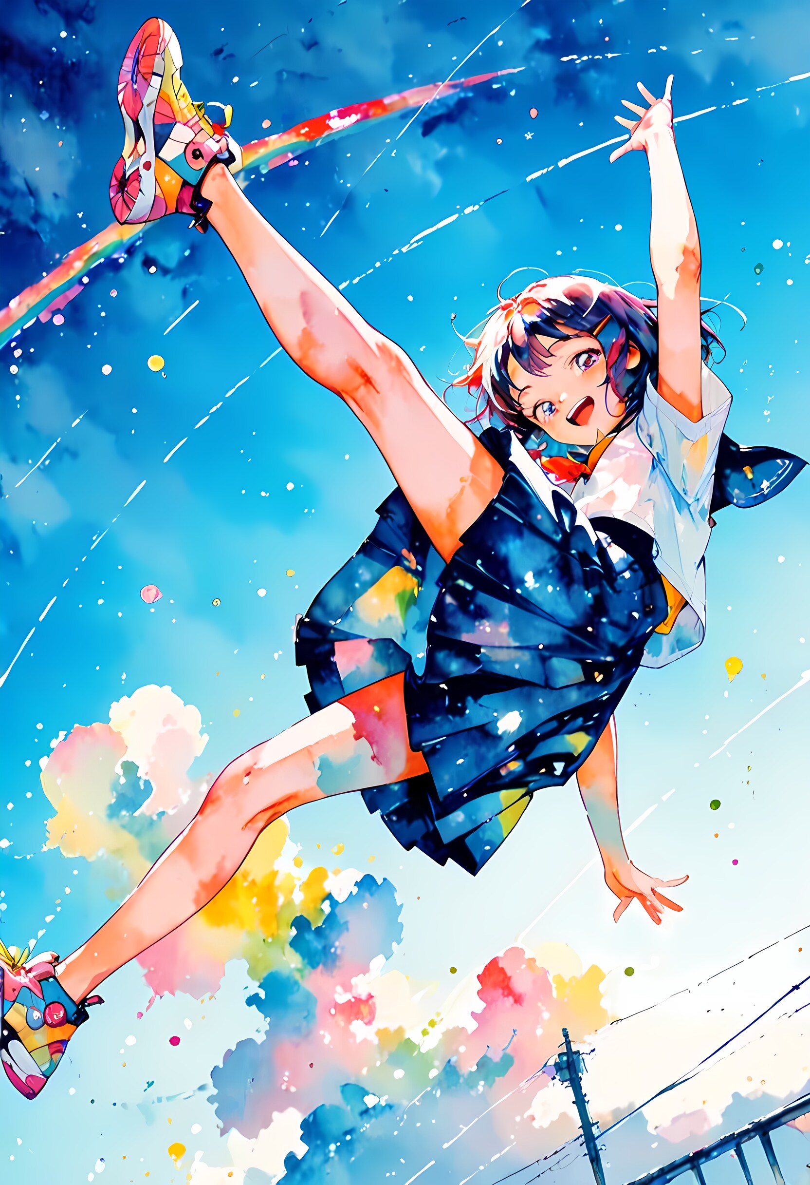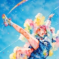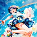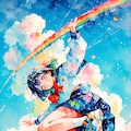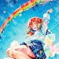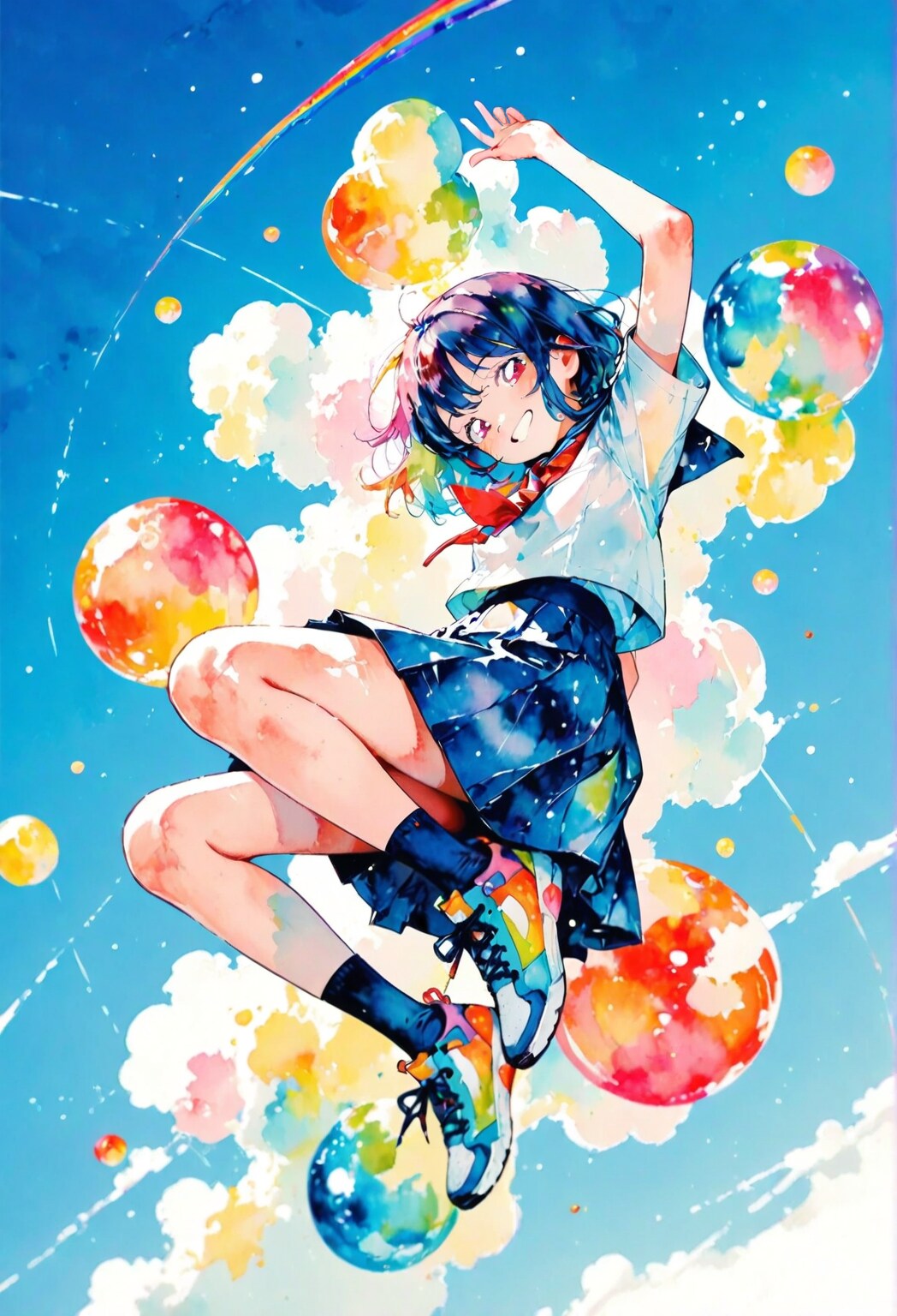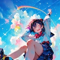 「見て、今の私、どこまでだって飛んでいけそうな気がする! 重たい荷物も、昨日の悩みも、ぜーんぶ背中に置いてきちゃった。 見上げてみて。雲がこんなにカラフルで、風までもが虹色に溶けてるの。 体がふわっと軽くなるこの瞬間が、私はいちばん好き。 明日なんて考えない。ただ、今この空の青さを全身で感じていたいんだ。 ねぇ、この景色、キミにも見せたいな! どこまでも高く、もっと遠くへ。一緒に飛び込んでみない?」