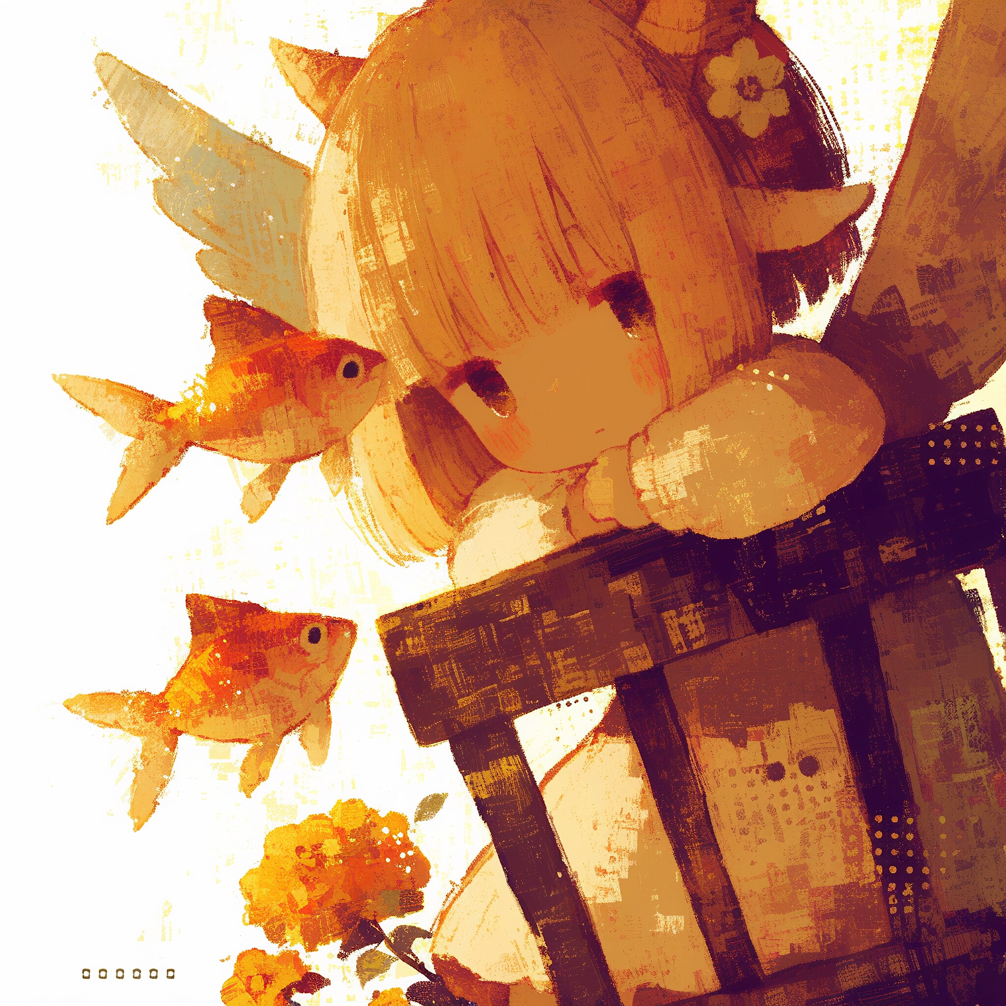 lowbrow art, smooth curves and dotted line, exquisitely detailed impasto, complicated cubism, sitting backward in chair, holding chair, resting chin on chair back, super slatternly pose, half open eyes, flower, dull blue, closeup of flying fish crossing near face, outrageous dynamic angle, close to viewer, upper body, limited palette, complementary accent colors, black and white, high contrast, solo, goat girl, horn, wings, girly pajamas, blant bangs, cute, kawaii, inside a sunny room, expressionless, vintage ambience, beautiful aesthetics, absurdres, highres, exquisitely detailed, very precise detailed, best quality, 16k --niji 6 --s 450 --ar 1:1 --style raw --sref 3604182537::1 2245599450::1 568688171::1 2531504802::1 3266919641::4 784333450::1 --sw 40 --p kmo19ek --no flat