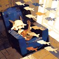 lowbrow art, smooth curves and dotted line, exquisitely detailed impasto, complicated cubism, collage, sitting backward in chair, holding chair, resting chin on chair back, super slatternly pose, look around, flower, dull blue, closeup of flying fish crossing near face, outrageous dynamic angle, close to viewer, upper body, limited palette, complementary accent colors, black and white, high contrast, solo, goat girl, horn, wings, girly fashion, blant bangs, cute, kawaii, inside a sunny room, expressionless, vintage ambience, beautiful aesthetics, absurdres, highres, exquisitely detailed, very precise detailed, best quality, 16k --niji 6 --s 500 --ar 1:1 --style raw --sref 3604182537::1 2245599450::1 568688171::1 2531504802::1 3266919641::4 784333450::1 --sw 40 --p kmo19ek --no flat