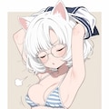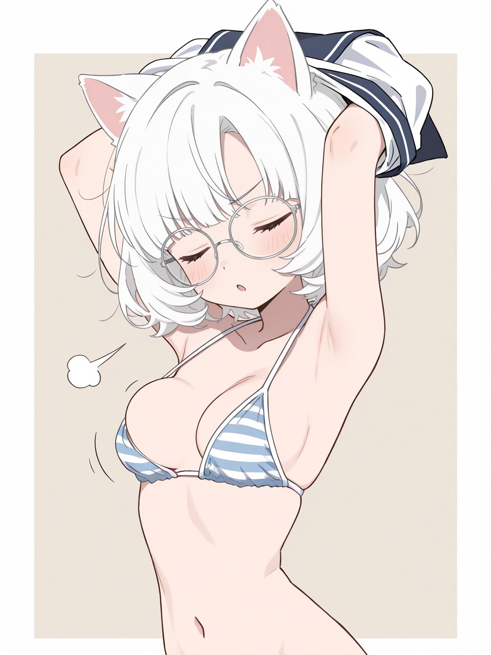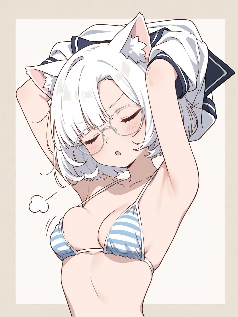 undressing serafuku, white clothes, short sleeves, blue striped bikini, (unworn serafuku:1.2), arms up, armpits