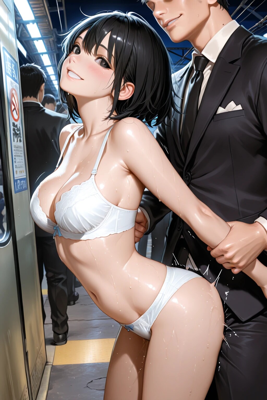 「終電が過ぎた、二人だけの無人駅。 冷たい夜気に包まれたホームで、彼女の理性が音を立てて崩れ去った。 さっきまで凛としていたはずの紺色のスーツ。 その下で、彼女はすでに熱を帯び、耐えきれぬ疼きに身を震わせていた。 『……ねえ、ここでして?』 その一言が、静寂を切り裂く合図。 一枚、また一枚と、アスファルトの上に脱ぎ捨てられる日常。 街灯の光の下、あらわになった白磁の裸体が、不器用なほどに合体を求めてしなだれかかる。 鉄の匂いと、夜風が運ぶ彼女の吐息。 誰かに見られるかもしれないという恐怖さえ、今は最高の愛撫でしかない。 本能のままに繋がる二人の影は、夜の闇にどこまでも溶けていった――。」 こちら支援者のみ続きが見れます。