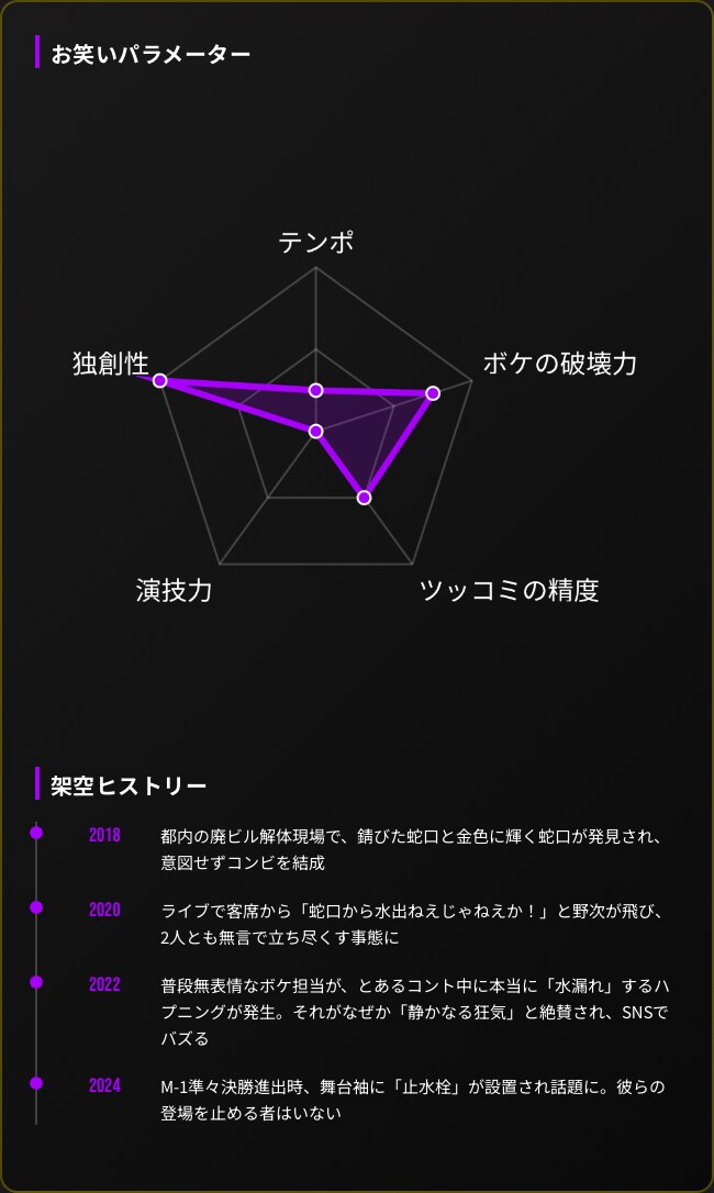 解体寸前の「全日本・水道哲学研究所」跡地。瓦礫の中から発見されたのは、意志を持つ二つの蛇口だった。ボケの「まわ」が放った「ネジのピッチ、合ってると思わない?」という誘いに、ツッコミの「みず」が吠える。これが「湯水マリアージュ」の産声だ。当初は人間でないがゆえにM-1出場を阻まれたが、「自走可能なら可」という屁理屈のような特例を勝ち取り、彼らは劇場の舞台に立った。しかし、観客の反応は冷淡だった。2020年には「水が出ねえじゃねえか!」という野次を浴び、二人は無言で立ち尽くす。しかし、その屈辱こそが彼らを「水」ではなく「笑い」を出す純粋な漫才師へと変貌させた。2022年、極度の緊張からまわが「水漏れ」を起こすハプニングが「静かなる狂気」と絶賛され、SNSでバズを引き起こす。彼らはもはやただの蛇口ではない。舞台袖に止水栓を設置されるほど、誰にも止められない濁流となっていた。