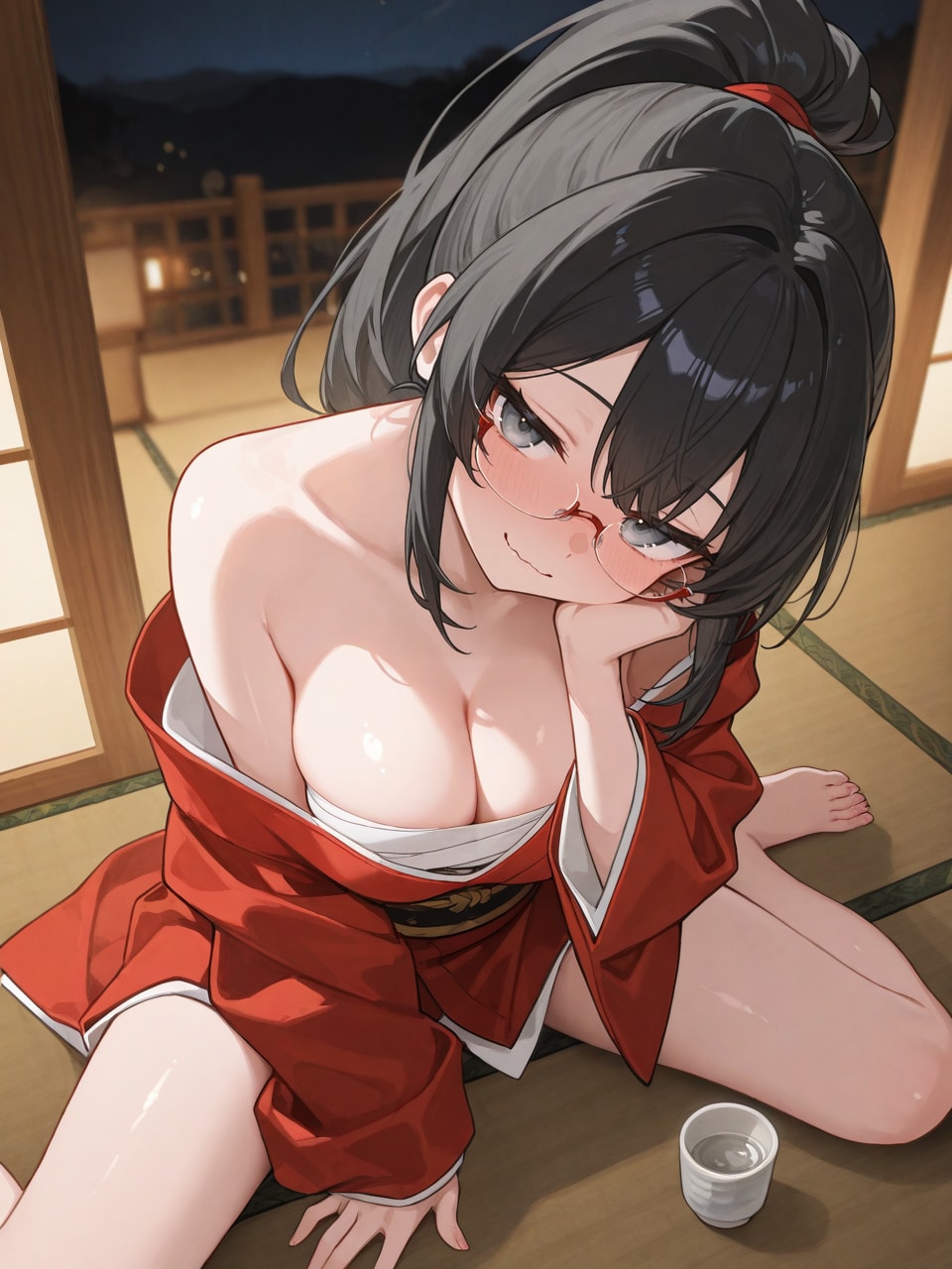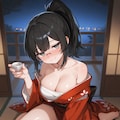 arm support, (arm between thigs:1.2), (hand up:1.1), (holding choko \(cup\):1.2)