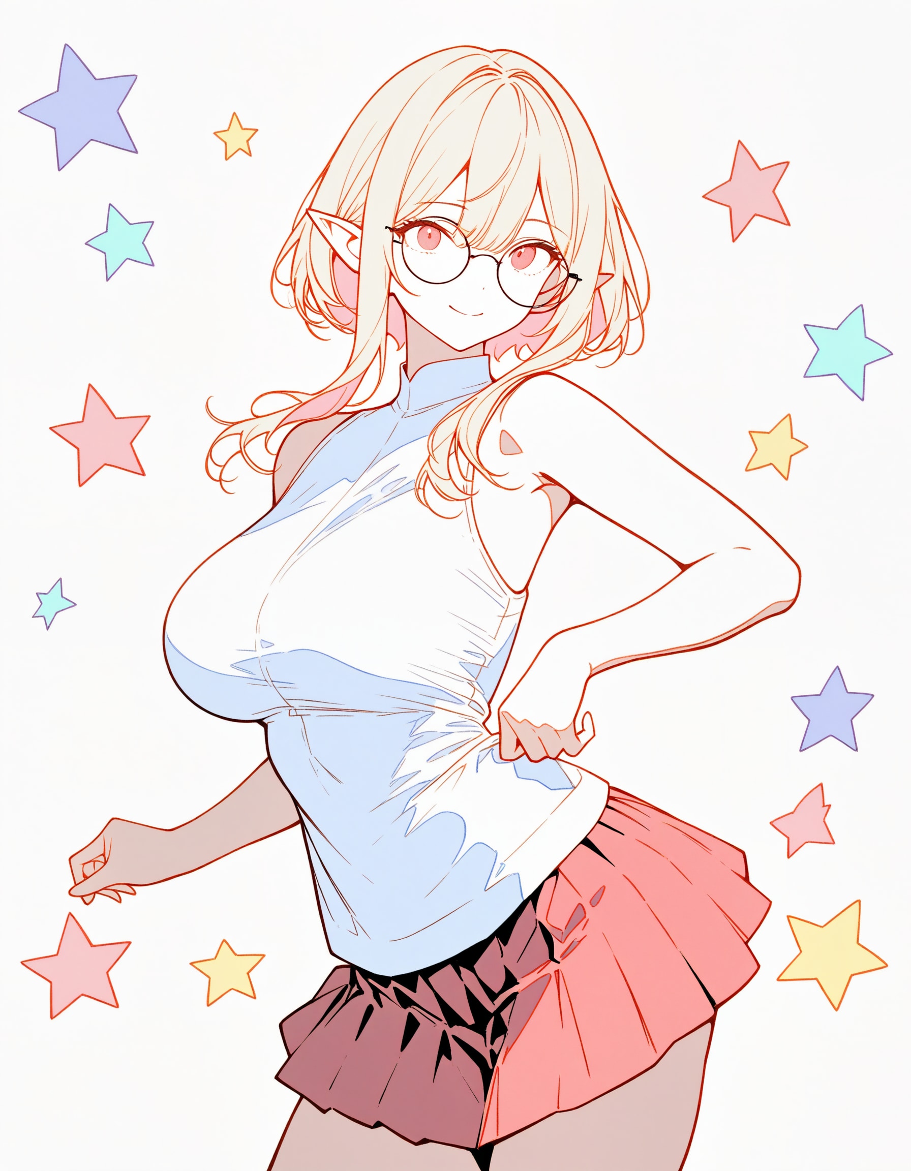 An elf girl spins clockwise. As she spins, her clothes change into a cute magical girl outfit, emitting magical effects. Countless pop star patterns around her continue to rotate and rise into the sky. The girl's hair and outfit flutter gently in time with her movements.
