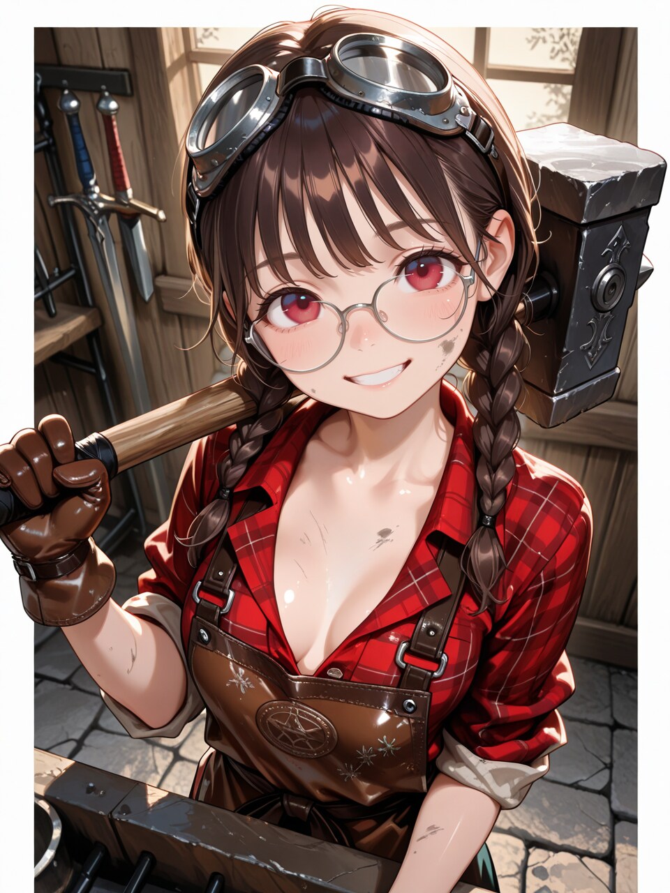 red plaid shirt, sleeves rolled up, brown leather apron,
