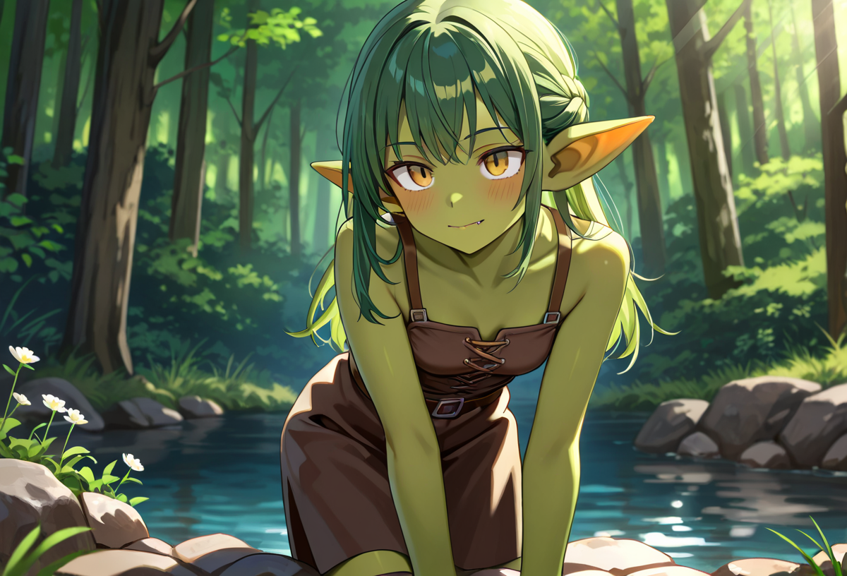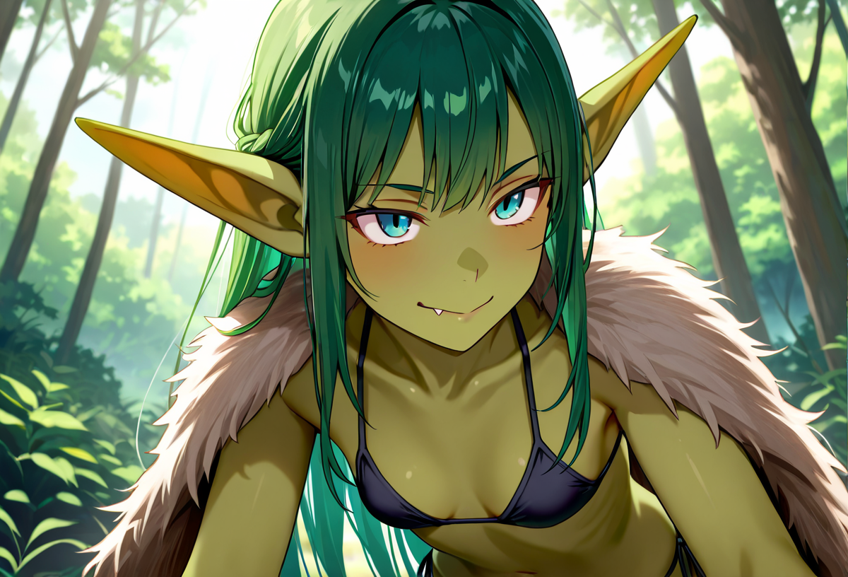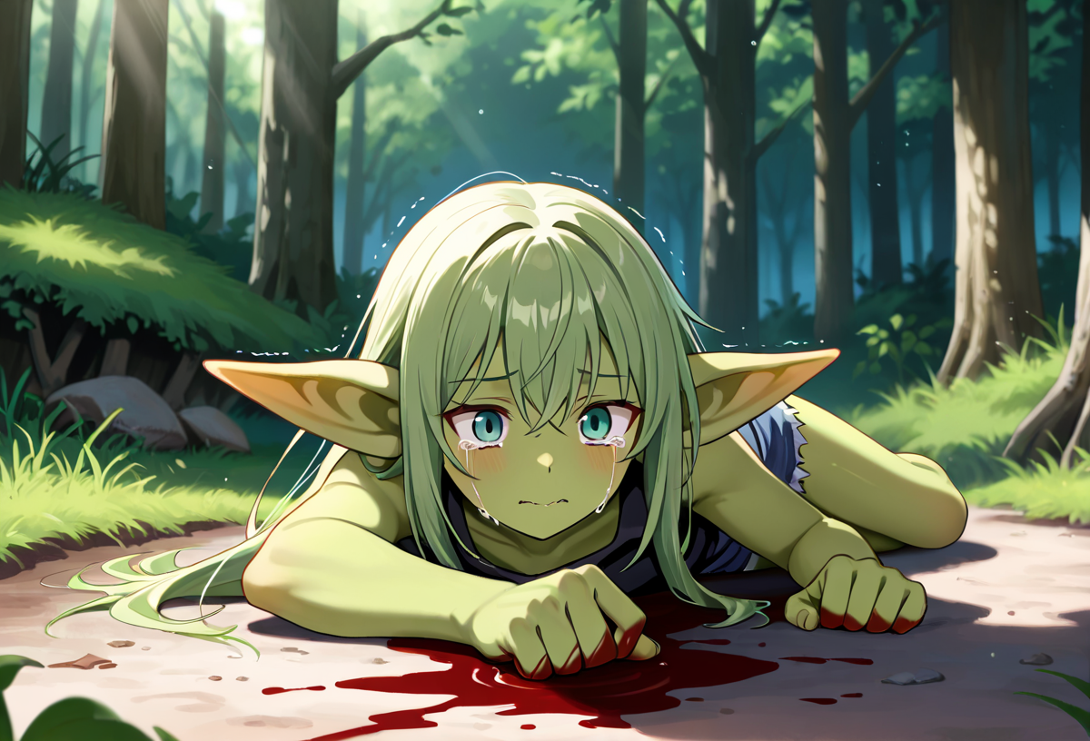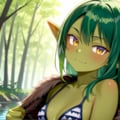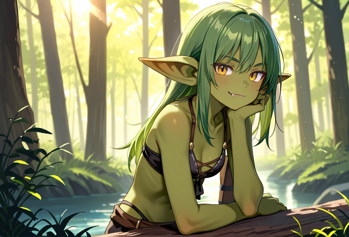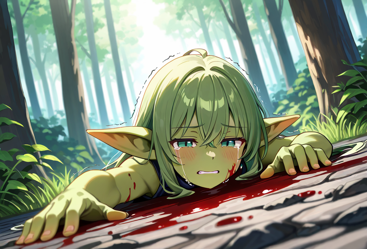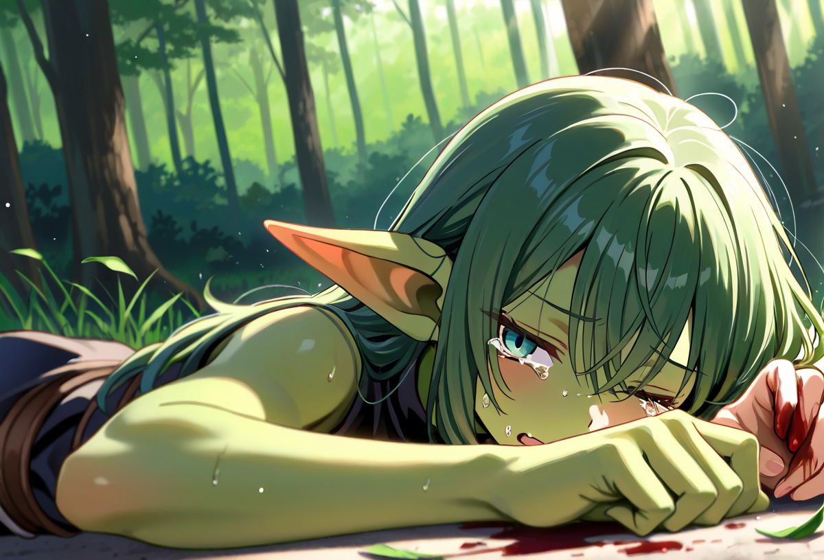 ■森での出会い 冒険者の俺は瀕死の重傷で動けなくなっていた。魔獣討伐の依頼で森に入り、壮絶な戦いの末に重傷を負い、手負いの魔獣を一歩のところで逃がしてしまった。血が止まらない。視界もぼやけてきた。やばい。死にそうだ。 そんな状況でゴブリンに見つかってしまった。覚悟を決めたが、不思議なことに襲ってくる気配はない。雌ゴブリンが一人だけのようだ。奴は遠くからこちらの様子をうかがっている。こちらも戦える状態ではない。片方の足は折れているし、武器を握る力も残っていない。 彼女は少しずつ近づいてきた。そして、俺に話しかけてきた。「お前、死ぬのか?」その声はどこか優しさを含んでいて、俺は戸惑いながら答えた。「そのうちな。」 彼女は俺の様子をじっと見つめた後、何も言わずに引き返していった。俺は、金目のものも有用なアイテムも財宝も持っていないので、彼女が興味を失ったのだろうと思った。しかし、ほどなくして彼女は再び現れた。 俺は警戒した。しまった、仲間を呼びに行っていたのか!と思ったが、彼女はまた一人だった。そして、手には果物や薬草の束を持っている。 「食えだにぃ。」そう言って彼女は果物を俺の前に置いた。俺は驚きつつもその果物を手に取り、かじった。甘酸っぱい味が口の中に広がり、少しだけ体力が戻るのを感じた。彼女は薬草を手に取り、俺の傷口にそっと塗り始めた。その動作は驚くほど丁寧で、まるで人間の治療師のようだった。 ■孤独の理由 彼女が俺の世話を続けるうちに、少しずつ互いのことを話すようになった。彼女の名前は「リナ」だということが分かった。そして、彼女がなぜ群れからはぐれて一人でいるのかも。 「お前、群れには戻らないのか?」俺が尋ねると、リナは少し沈黙した後で答えた。「戻れないだにぃ。私、ゴブリンの目から見たらとんでもないブスだにぃ。だから、みんな私を嫌うだにぃ。」 俺は驚いた。リナの顔をじっくり見てみると、確かにゴブリンの基準ではそうなのかもしれないが、人間の目から見ると美人と言える容姿だった。彼女の大きな瞳や整った顔立ちは、俺には魅力的に映った。 「いや、俺から見たら美人だぞ。」俺がそう伝えると、リナは一瞬驚いた表情を見せた後、少し嬉しそうに笑った。「お前、変わったやつだにぃ。でも、ありがとうだにぃ。」 その後、リナは少しはにかんだ様子でこう言った。「お前もなかなかイケメンだにぃ。」 その言葉に俺は苦笑した。ゴブリンの目から見てイケメンということは、人間の目から見て俺はどうなのかっていうと心当たりがあった。俺は女性には全くモテたことがない。むしろ、顔が原因で避けられることすらあった。 「俺がイケメンなら、お前の群れのゴブリンたちも見る目がないな。」俺は冗談交じりに言った。リナは笑いながら答えた。「お前、面白いやつだにぃ。」 ■絆が深まる日々 その後も彼女は俺の世話を続けた。食料を持ってきたり、傷の手当をしたり、森の安全な場所に案内してくれたりした。俺は徐々に回復し、彼女と話す時間が増えていった。彼女の孤独な生活や、他のゴブリンたちとの違いが徐々に分かってきた。 「お前、人間なのに不思議だにぃ。怖がらないだにぃ。」リナはある日そう言った。俺は笑いながら答えた。「お前もゴブリンなのに不思議だ。俺を襲わない。」 その瞬間、俺たちの間に何か特別なものが生まれた気がした。彼女の笑顔を見るたびに、俺は心が温かくなるのを感じた。そして、俺は気付いた。俺はリナに恋をしていた。 ■別れと約束 俺が完全に回復した頃、リナは静かに言った。「お前、もう帰れるだにぃ。でも、また会いたいだにぃ。」俺は頷き、彼女に感謝を伝えた。そして、森を去る前にこう言った。「必ず戻る。お前に会いに。」 それから数週間後、俺は再び森に足を踏み入れた。リナが待っている場所を目指して。 その時、遠くから聞こえる叫び声と剣の音に気づいた。急いで駆けつけると、リナが人間の冒険者たちに襲われているところだった。彼らはリナを単なるゴブリンと見なし、容赦なく剣を振り下ろしていた。 「やめろ!」俺は叫びながら間に割って入った。冒険者たちは驚き、俺を見て止まった。「なぜゴブリンを守るんだ?」彼らは訝しげに問うたが、俺は答えなかった。ただ、剣を抜き、リナを守ると決めた。 俺はなんとか冒険者たちを傷つけることなく、リナを救出することに成功した。彼女は軽傷だったが、恐怖と疲労で震えていた。冒険者たちは俺を裏切り者と見なし、街に戻ることはもうできないだろう。 「あーあ、もう俺街に戻れねえや。」俺がそう呟くと、リナは顔を赤くしながら言った。「じゃあずっと一緒にうちと暮らせばいいだにぃ。」その言葉には、彼女の真っ直ぐな気持ちが込められていた。 俺は少し驚きながらも笑って答えた。「それもいいかもな。」そして俺たちは森での二人だけの生活を始めた。 ※初体験編(R18) http