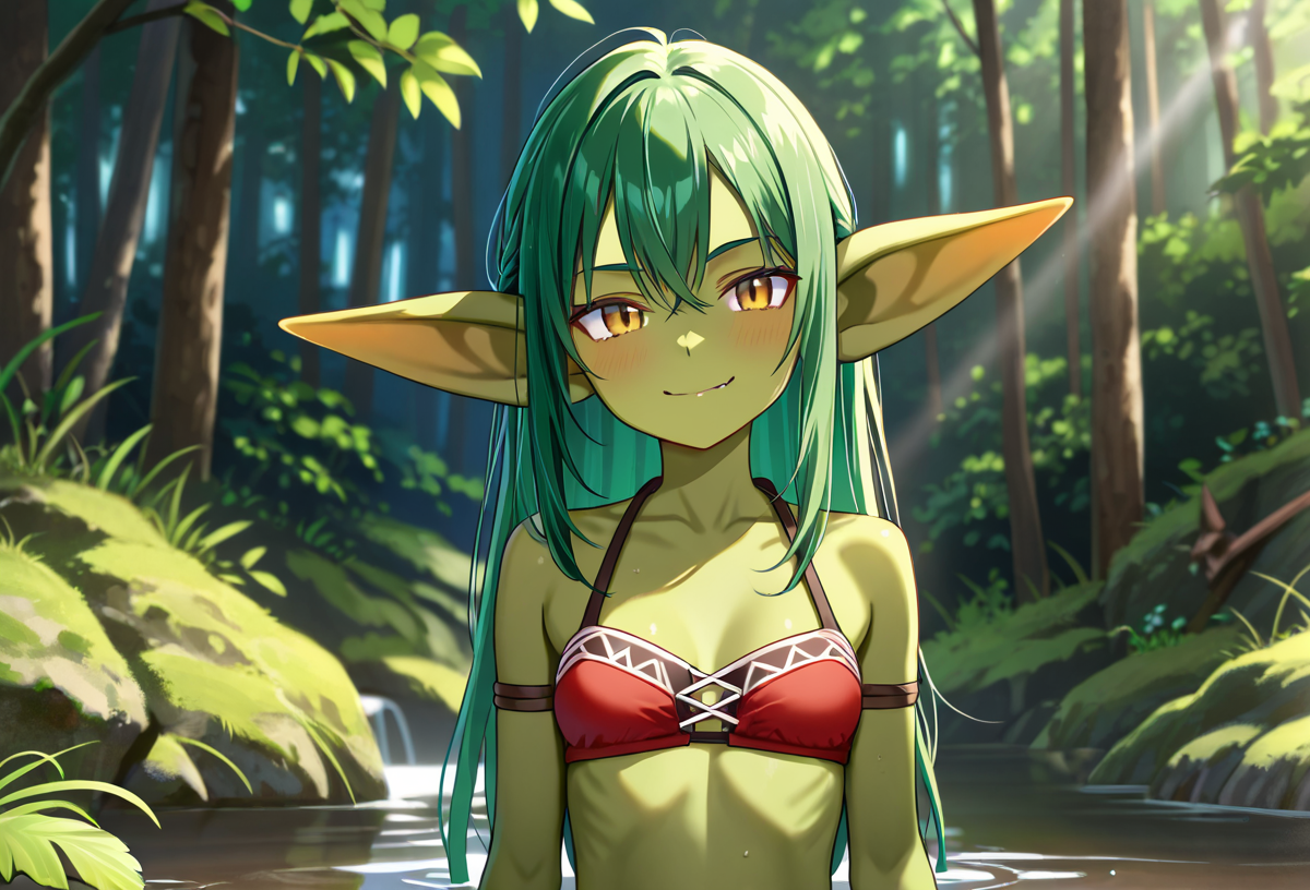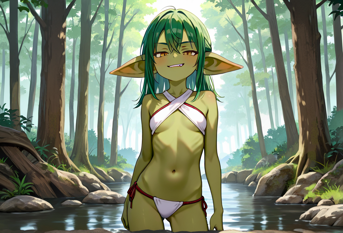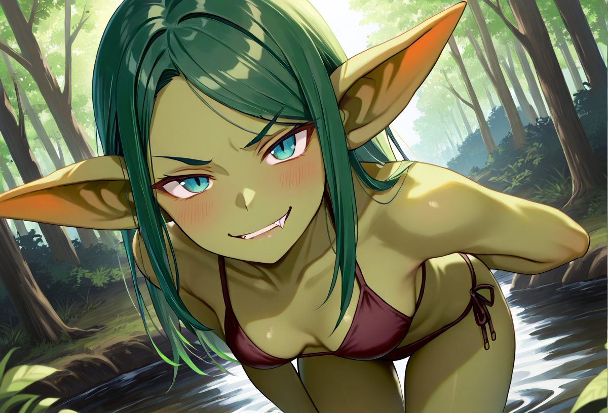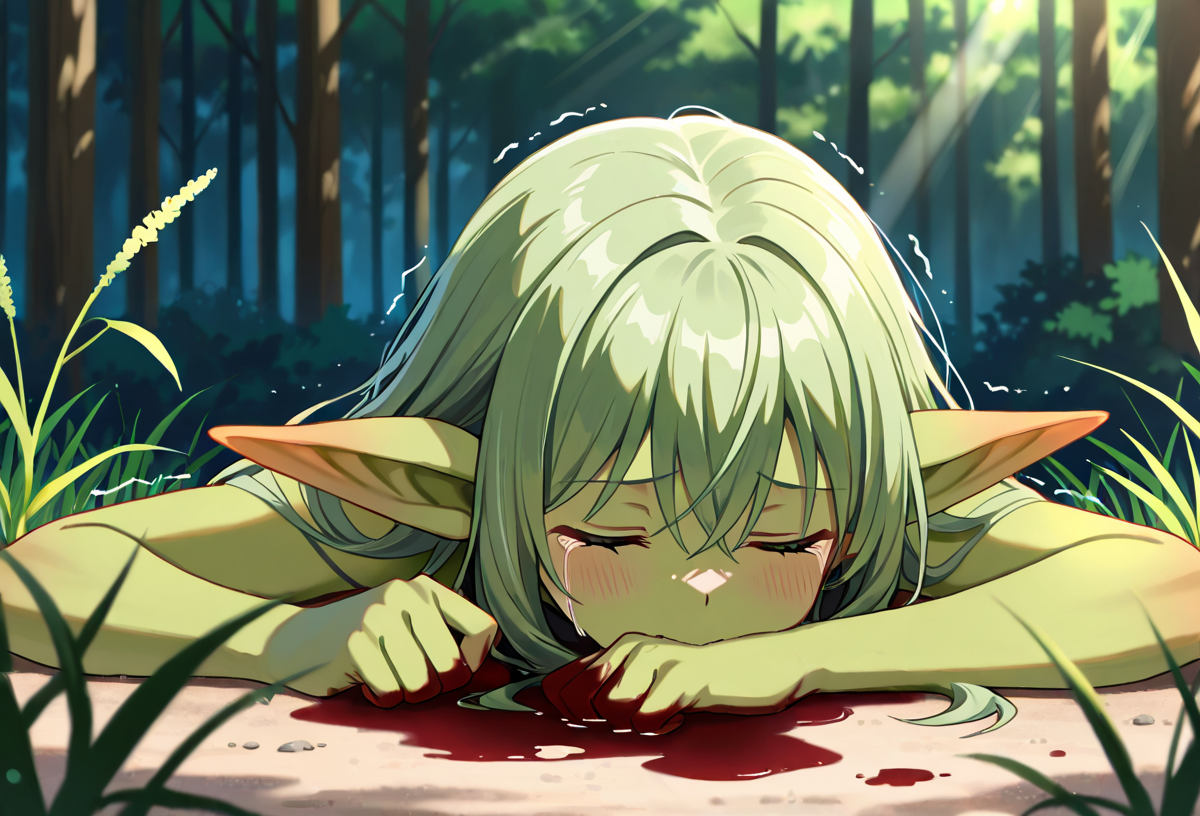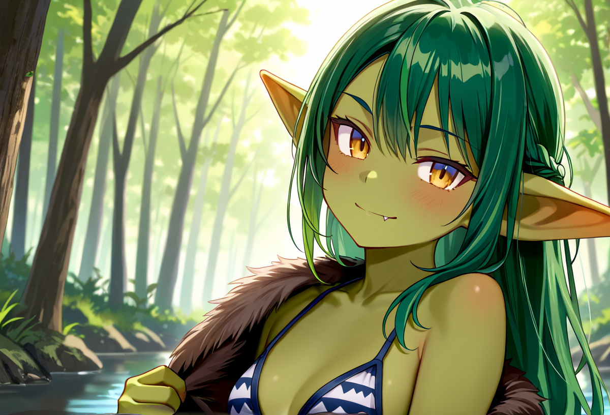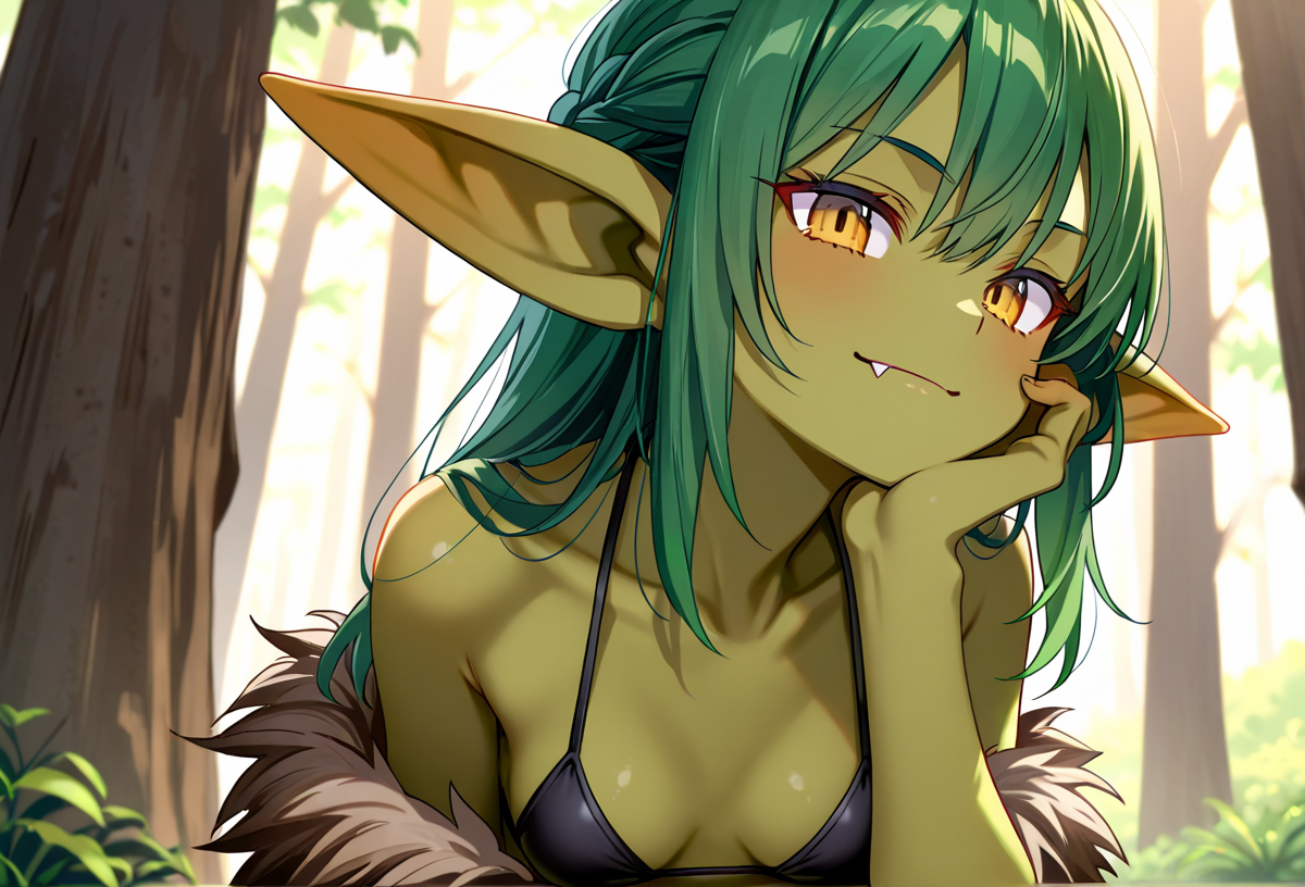 ■森での出会い 冒険者の俺は瀕死の重傷で動けなくなっていた。魔獣討伐の依頼で森に入り、壮絶な戦いの末に重傷を負い、手負いの魔獣を一歩のところで逃がしてしまった。血が止まらない。視界もぼやけてきた。やばい。死にそうだ。 そんな状況でゴブリンに見つかってしまった。覚悟を決めたが、不思議なことに襲ってくる気配はない。雌ゴブリンが一人だけのようだ。奴は遠くからこちらの様子をうかがっている。こちらも戦える状態ではない。片方の足は折れているし、武器を握る力も残っていない。 彼女は少しずつ近づいてきた。そして、俺に話しかけてきた。「お前、死ぬのか?」その声はどこか優しさを含んでいて、俺は戸惑いながら答えた。「そのうちな。」 彼女は俺の様子をじっと見つめた後、何も言わずに引き返していった。俺は、金目のものも有用なアイテムも財宝も持っていないので、彼女が興味を失ったのだろうと思った。しかし、ほどなくして彼女は再び現れた。 俺は警戒した。しまった、仲間を呼びに行っていたのか!と思ったが、彼女はまた一人だった。そして、手には果物や薬草の束を持っている。 「食えだにぃ。」そう言って彼女は果物を俺の前に置いた。俺は驚きつつもその果物を手に取り、かじった。甘酸っぱい味が口の中に広がり、少しだけ体力が戻るのを感じた。彼女は薬草を手に取り、俺の傷口にそっと塗り始めた。その動作は驚くほど丁寧で、まるで人間の治療師のようだった。 ■孤独の理由 彼女が俺の世話を続けるうちに、少しずつ互いのことを話すようになった。彼女の名前は「リナ」だということが分かった。そして、彼女がなぜ群れからはぐれて一人でいるのかも。 「お前、群れには戻らないのか?」俺が尋ねると、リナは少し沈黙した後で答えた。「戻れないだにぃ。私、ゴブリンの目から見たらとんでもないブスだにぃ。だから、みんな私を嫌うだにぃ。」 俺は驚いた。リナの顔をじっくり見てみると、確かにゴブリンの基準ではそうなのかもしれないが、人間の目から見ると美人と言える容姿だった。彼女の大きな瞳や整った顔立ちは、俺には魅力的に映った。 「いや、俺から見たら美人だぞ。」俺がそう伝えると、リナは一瞬驚いた表情を見せた後、少し嬉しそうに笑った。「お前、変わったやつだにぃ。でも、ありがとうだにぃ。」 その後、リナは少しはにかんだ様子でこう言った。「お前もなかなかイケメンだにぃ。」 その言葉に俺は苦笑した。ゴブリンの目から見てイケメンということは、人間の目から見て俺はどうなのかっていうと心当たりがあった。俺は女性には全くモテたことがない。むしろ、顔が原因で避けられることすらあった。 「俺がイケメンなら、お前の群れのゴブリンたちも見る目がないな。」俺は冗談交じりに言った。リナは笑いながら答えた。「お前、面白いやつだにぃ。」 ■絆が深まる日々 その後も彼女は俺の世話を続けた。食料を持ってきたり、傷の手当をしたり、森の安全な場所に案内してくれたりした。俺は徐々に回復し、彼女と話す時間が増えていった。彼女の孤独な生活や、他のゴブリンたちとの違いが徐々に分かってきた。 「お前、人間なのに不思議だにぃ。怖がらないだにぃ。」リナはある日そう言った。俺は笑いながら答えた。「お前もゴブリンなのに不思議だ。俺を襲わない。」 その瞬間、俺たちの間に何か特別なものが生まれた気がした。彼女の笑顔を見るたびに、俺は心が温かくなるのを感じた。そして、俺は気付いた。俺はリナに恋をしていた。 ■別れと約束 俺が完全に回復した頃、リナは静かに言った。「お前、もう帰れるだにぃ。でも、また会いたいだにぃ。」俺は頷き、彼女に感謝を伝えた。そして、森を去る前にこう言った。「必ず戻る。お前に会いに。」 それから数週間後、俺は再び森に足を踏み入れた。リナが待っている場所を目指して。 その時、遠くから聞こえる叫び声と剣の音に気づいた。急いで駆けつけると、リナが人間の冒険者たちに襲われているところだった。彼らはリナを単なるゴブリンと見なし、容赦なく剣を振り下ろしていた。 「やめろ!」俺は叫びながら間に割って入った。冒険者たちは驚き、俺を見て止まった。「なぜゴブリンを守るんだ?」彼らは訝しげに問うたが、俺は答えなかった。ただ、剣を抜き、リナを守ると決めた。 俺はなんとか冒険者たちを傷つけることなく、リナを救出することに成功した。彼女は軽傷だったが、恐怖と疲労で震えていた。冒険者たちは俺を裏切り者と見なし、街に戻ることはもうできないだろう。 「あーあ、もう俺街に戻れねえや。」俺がそう呟くと、リナは顔を赤くしながら言った。「じゃあずっと一緒にうちと暮らせばいいだにぃ。」その言葉には、彼女の真っ直ぐな気持ちが込められていた。 俺は少し驚きながらも笑って答えた。「それもいいかもな。」そして俺たちは森での二人だけの生活を始めた。 ※初体験編(R18) http