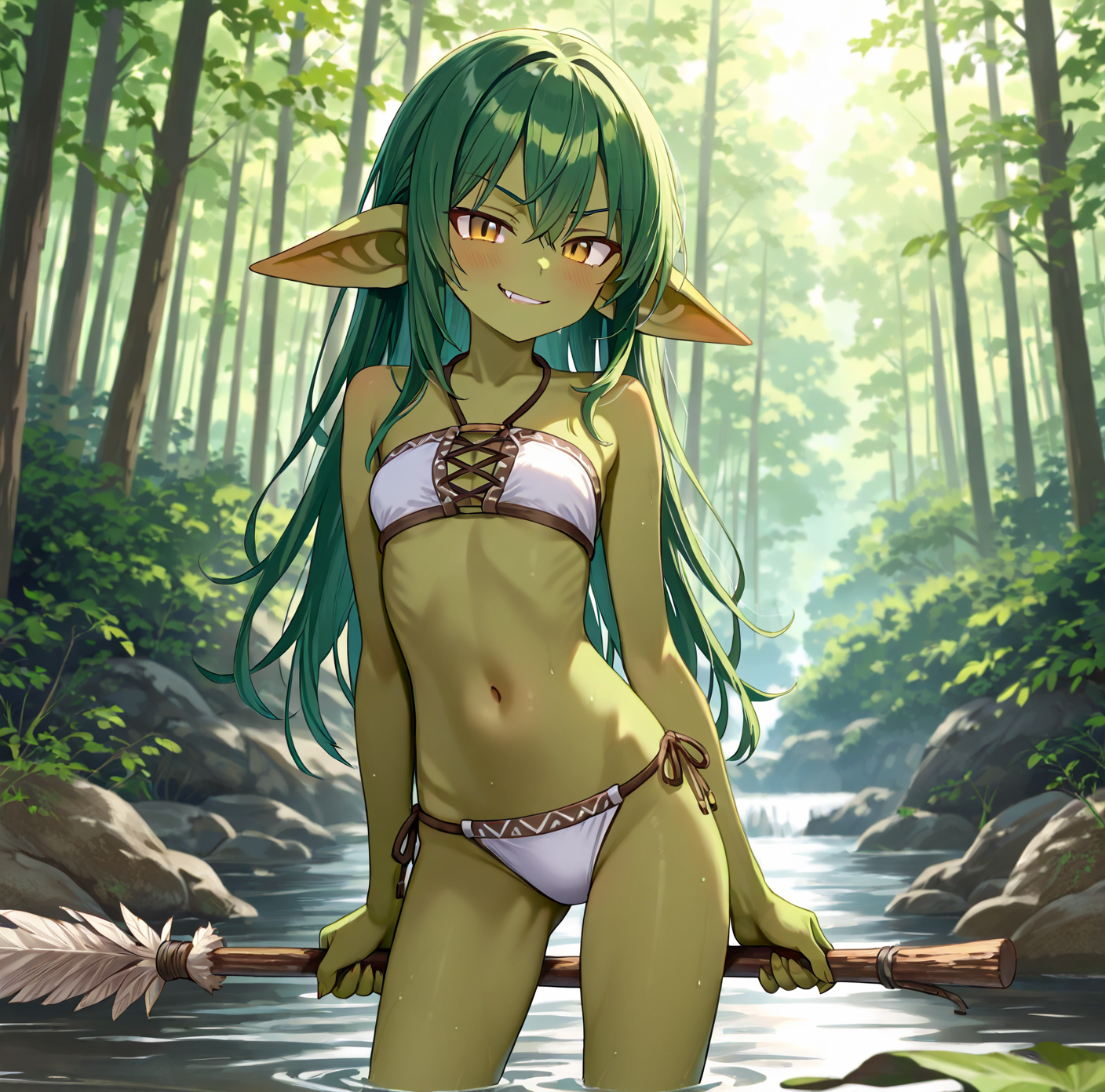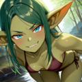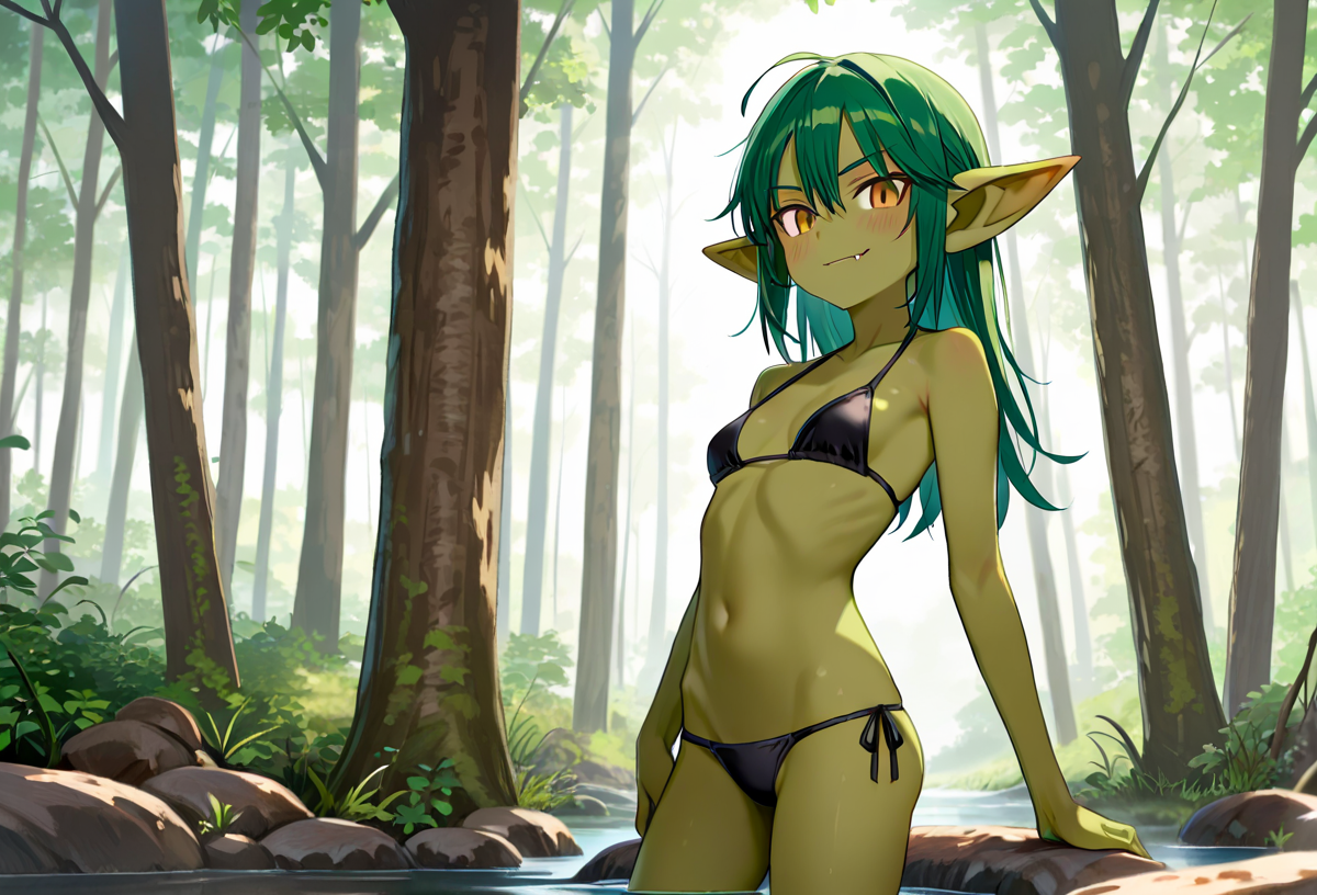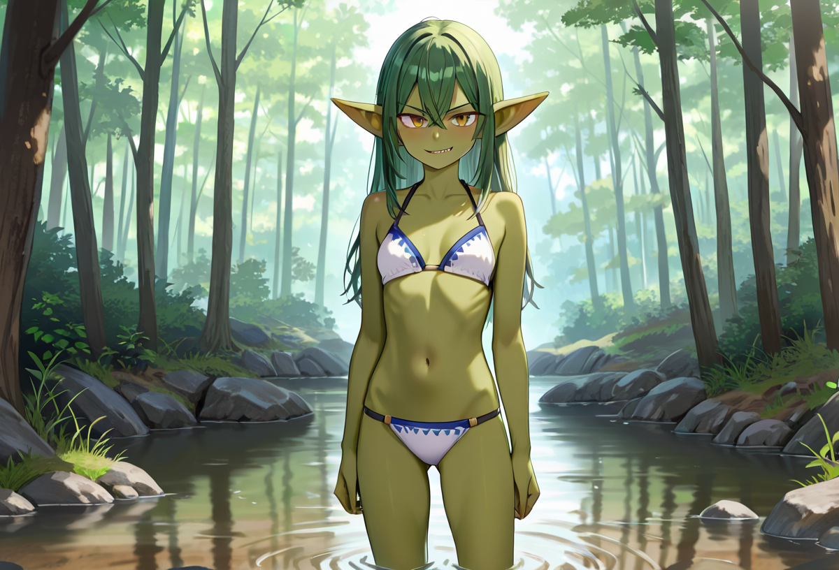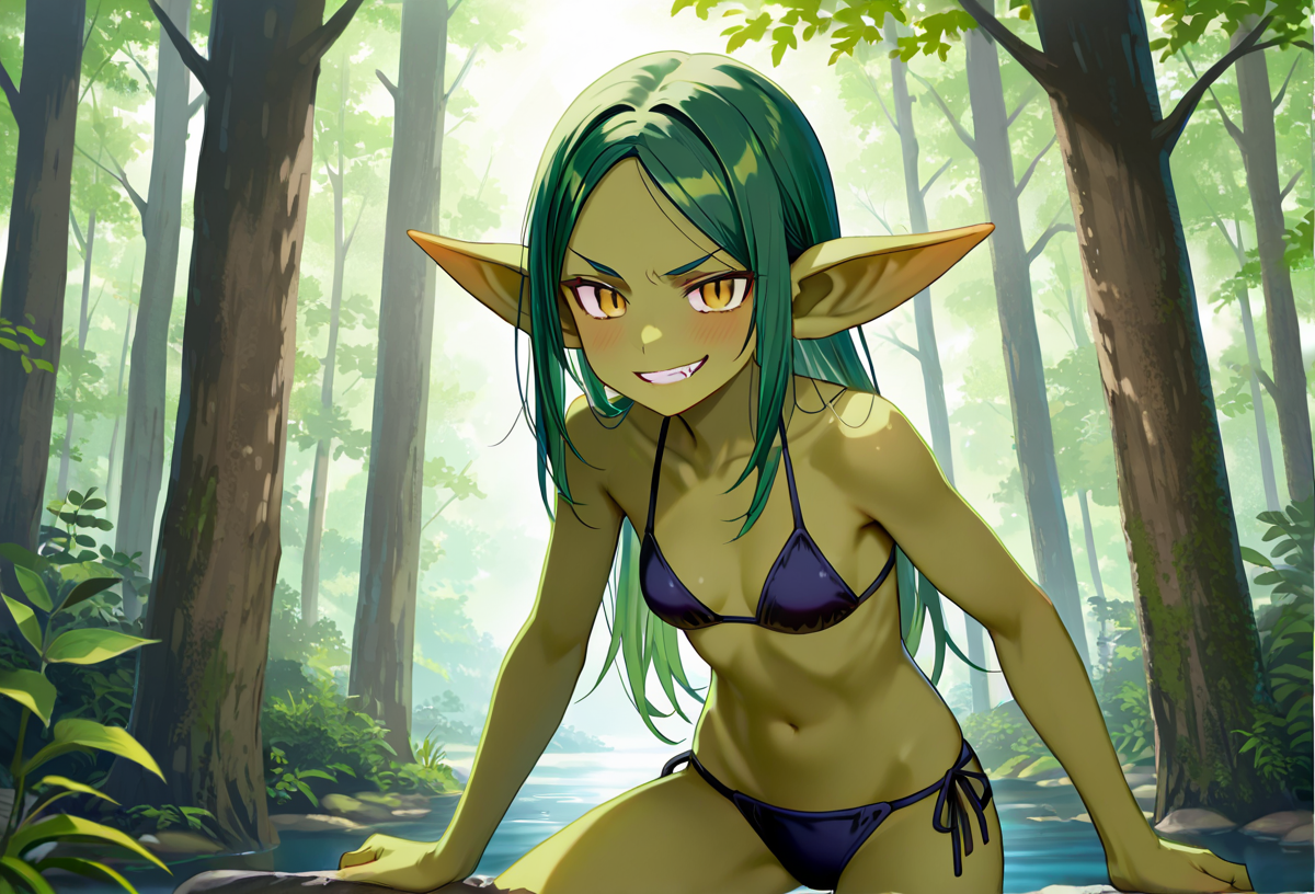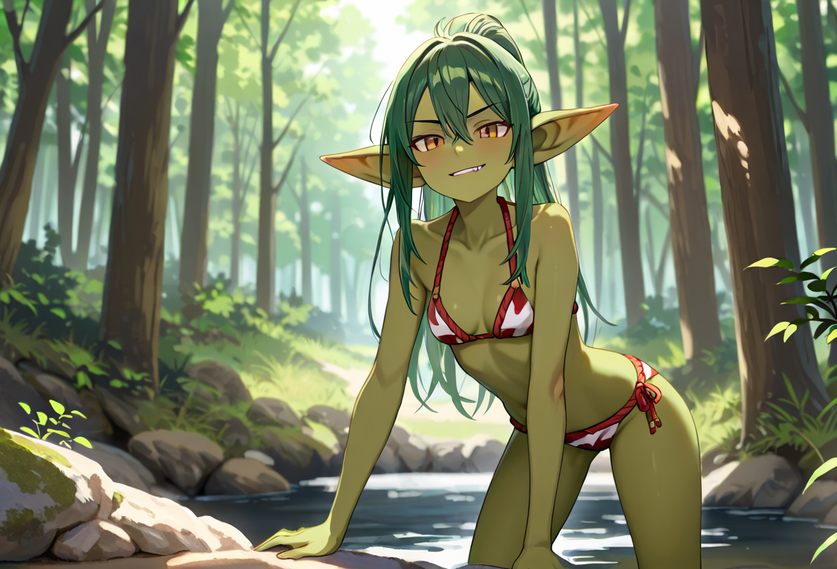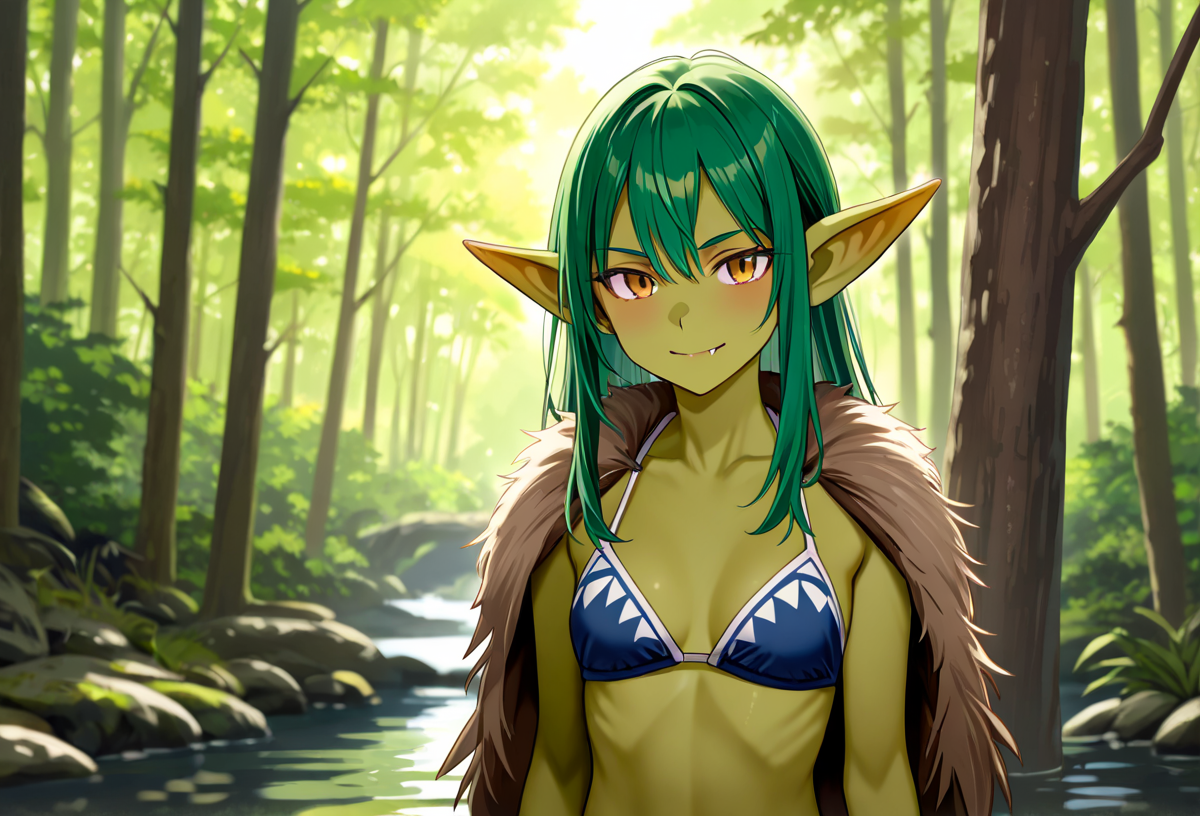 ■森での出会い 冒険者の俺は瀕死の重傷で動けなくなっていた。魔獣討伐の依頼で森に入り、壮絶な戦いの末に重傷を負い、手負いの魔獣を一歩のところで逃がしてしまった。血が止まらない。視界もぼやけてきた。やばい。死にそうだ。 そんな状況でゴブリンに見つかってしまった。覚悟を決めたが、不思議なことに襲ってくる気配はない。雌ゴブリンが一人だけのようだ。奴は遠くからこちらの様子をうかがっている。こちらも戦える状態ではない。片方の足は折れているし、武器を握る力も残っていない。 彼女は少しずつ近づいてきた。そして、俺に話しかけてきた。「お前、死ぬのか?」その声はどこか優しさを含んでいて、俺は戸惑いながら答えた。「そのうちな。」 彼女は俺の様子をじっと見つめた後、何も言わずに引き返していった。俺は、金目のものも有用なアイテムも財宝も持っていないので、彼女が興味を失ったのだろうと思った。しかし、ほどなくして彼女は再び現れた。 俺は警戒した。しまった、仲間を呼びに行っていたのか!と思ったが、彼女はまた一人だった。そして、手には果物や薬草の束を持っている。 「食えだにぃ。」そう言って彼女は果物を俺の前に置いた。俺は驚きつつもその果物を手に取り、かじった。甘酸っぱい味が口の中に広がり、少しだけ体力が戻るのを感じた。彼女は薬草を手に取り、俺の傷口にそっと塗り始めた。その動作は驚くほど丁寧で、まるで人間の治療師のようだった。 ■孤独の理由 彼女が俺の世話を続けるうちに、少しずつ互いのことを話すようになった。彼女の名前は「リナ」だということが分かった。そして、彼女がなぜ群れからはぐれて一人でいるのかも。 「お前、群れには戻らないのか?」俺が尋ねると、リナは少し沈黙した後で答えた。「戻れないだにぃ。私、ゴブリンの目から見たらとんでもないブスだにぃ。だから、みんな私を嫌うだにぃ。」 俺は驚いた。リナの顔をじっくり見てみると、確かにゴブリンの基準ではそうなのかもしれないが、人間の目から見ると美人と言える容姿だった。彼女の大きな瞳や整った顔立ちは、俺には魅力的に映った。 「いや、俺から見たら美人だぞ。」俺がそう伝えると、リナは一瞬驚いた表情を見せた後、少し嬉しそうに笑った。「お前、変わったやつだにぃ。でも、ありがとうだにぃ。」 その後、リナは少しはにかんだ様子でこう言った。「お前もなかなかイケメンだにぃ。」 その言葉に俺は苦笑した。ゴブリンの目から見てイケメンということは、人間の目から見て俺はどうなのかっていうと心当たりがあった。俺は女性には全くモテたことがない。むしろ、顔が原因で避けられることすらあった。 「俺がイケメンなら、お前の群れのゴブリンたちも見る目がないな。」俺は冗談交じりに言った。リナは笑いながら答えた。「お前、面白いやつだにぃ。」 ■絆が深まる日々 その後も彼女は俺の世話を続けた。食料を持ってきたり、傷の手当をしたり、森の安全な場所に案内してくれたりした。俺は徐々に回復し、彼女と話す時間が増えていった。彼女の孤独な生活や、他のゴブリンたちとの違いが徐々に分かってきた。 「お前、人間なのに不思議だにぃ。怖がらないだにぃ。」リナはある日そう言った。俺は笑いながら答えた。「お前もゴブリンなのに不思議だ。俺を襲わない。」 その瞬間、俺たちの間に何か特別なものが生まれた気がした。彼女の笑顔を見るたびに、俺は心が温かくなるのを感じた。そして、俺は気付いた。俺はリナに恋をしていた。 ■別れと約束 俺が完全に回復した頃、リナは静かに言った。「お前、もう帰れるだにぃ。でも、また会いたいだにぃ。」俺は頷き、彼女に感謝を伝えた。そして、森を去る前にこう言った。「必ず戻る。お前に会いに。」 それから数週間後、俺は再び森に足を踏み入れた。リナが待っている場所を目指して。 その時、遠くから聞こえる叫び声と剣の音に気づいた。急いで駆けつけると、リナが人間の冒険者たちに襲われているところだった。彼らはリナを単なるゴブリンと見なし、容赦なく剣を振り下ろしていた。 「やめろ!」俺は叫びながら間に割って入った。冒険者たちは驚き、俺を見て止まった。「なぜゴブリンを守るんだ?」彼らは訝しげに問うたが、俺は答えなかった。ただ、剣を抜き、リナを守ると決めた。 俺はなんとか冒険者たちを傷つけることなく、リナを救出することに成功した。彼女は軽傷だったが、恐怖と疲労で震えていた。冒険者たちは俺を裏切り者と見なし、街に戻ることはもうできないだろう。 「あーあ、もう俺街に戻れねえや。」俺がそう呟くと、リナは顔を赤くしながら言った。「じゃあずっと一緒にうちと暮らせばいいだにぃ。」その言葉には、彼女の真っ直ぐな気持ちが込められていた。 俺は少し驚きながらも笑って答えた。「それもいいかもな。」そして俺たちは森での二人だけの生活を始めた。 ※初体験編(R18) http