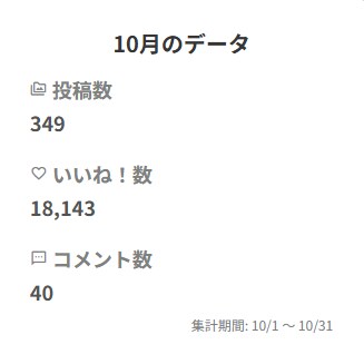 10月の投稿数349に対して55の減となっています。10月末で「おだんごちゃん🍡✨の夏」が終了したことがあると思いますが、当時すでに隔日企画だったのでそれ以外で30ほど投稿が少なくなっていたようです。減らしたつもりはなかったのですが、意外に減っていたんですね……。