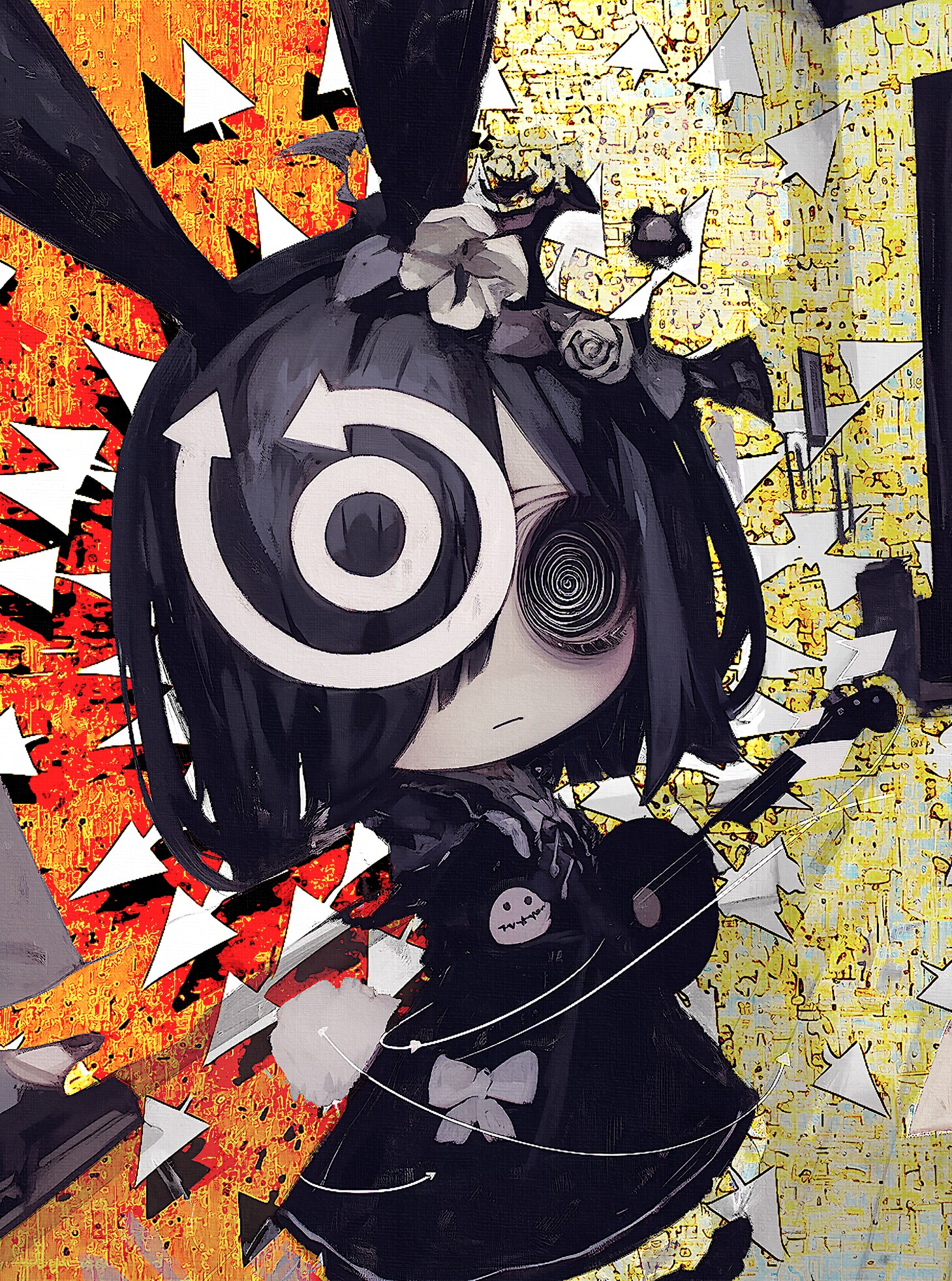 oil painting, impasto, cubism, incredibly bright colors, colorful, limited palette, complementary accent colors, black and white, high contrast, revolving arrow symbols, cute, kawaii, 1girl, spiral eye, hair over one eye, hair over face, rabbit ears, chubby tail, gothic girly fashion, holding flowery banjo by one hand, outrageous dynamic angle, hyper close to viewer, close-up, blant bangs, inside a sunny room, dotted line, expressionless, vintage ambience, absurdres, highres, exquisitely detailed, very precise detailed, best quality, 16k, highest image quality --niji 6 --s 400 --style raw --no play musical instrument, guitar, retro colors, banjo's body --sref 3604182537::2 2245599450::2 568688171::2 2531504802::2 3266919641::4 784333450::1 --sw 40 --ar 70:99