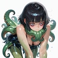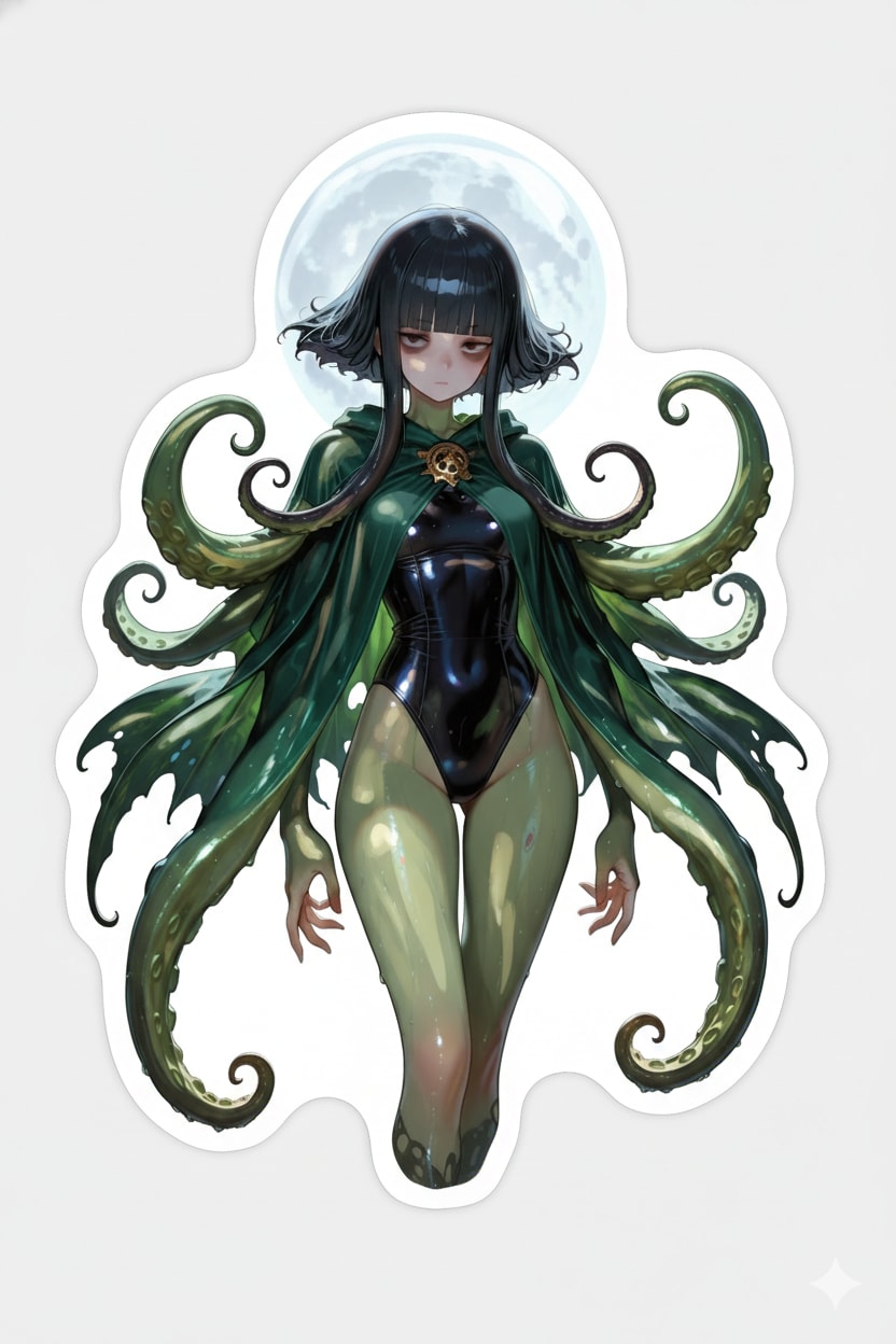 (masterpiece, best quality, ultra-detailed, 8k, hyper detailed), 1970s (style), dynamic pose, 1 monster girl, others, (cthulhu: 1.5), solo, simple background, white background, full body, muk, wet, (black hair: 1.3), black eyes, sanpaku, 20yo, short hair, 160 cm tall, bags under eyes, blunt bangs, water effects, colored skin, green skin, (green colored skin:1.5)