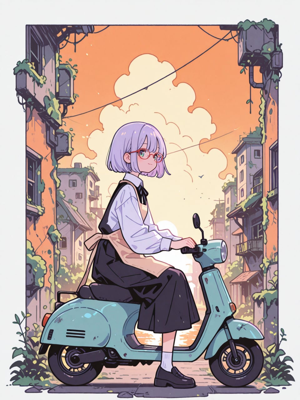 1girl, riding, light blue scooter, (from side:0.8), wide shot,