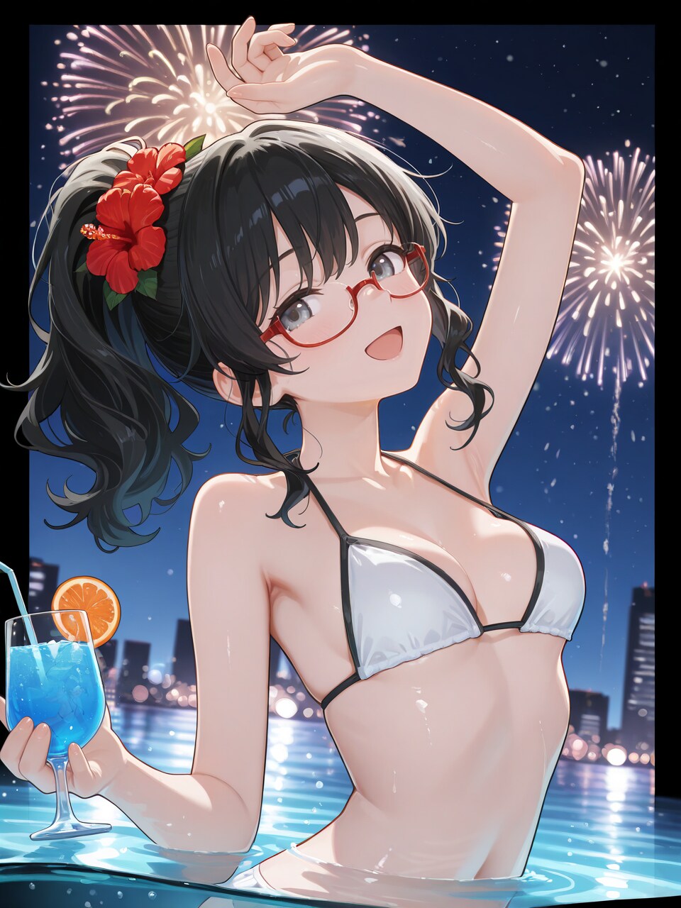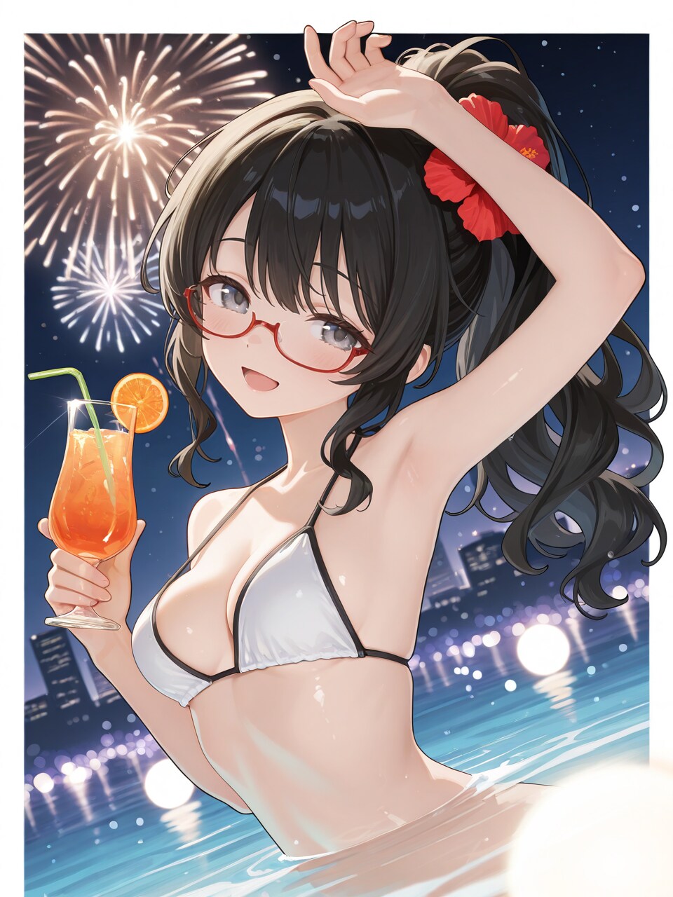 outdoors, in pool, (night, cityscape, building, starry sky:0.9), (underwater:0.8), colorful fireworks,