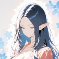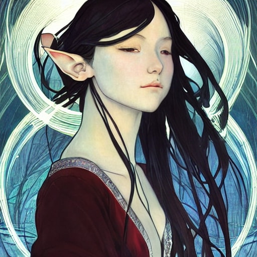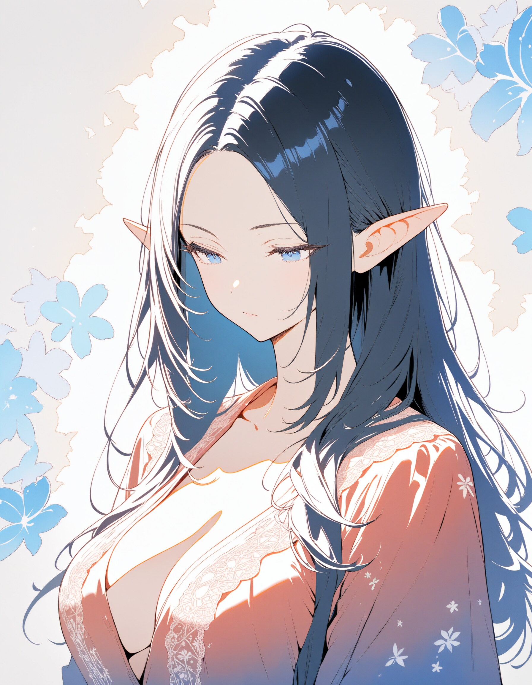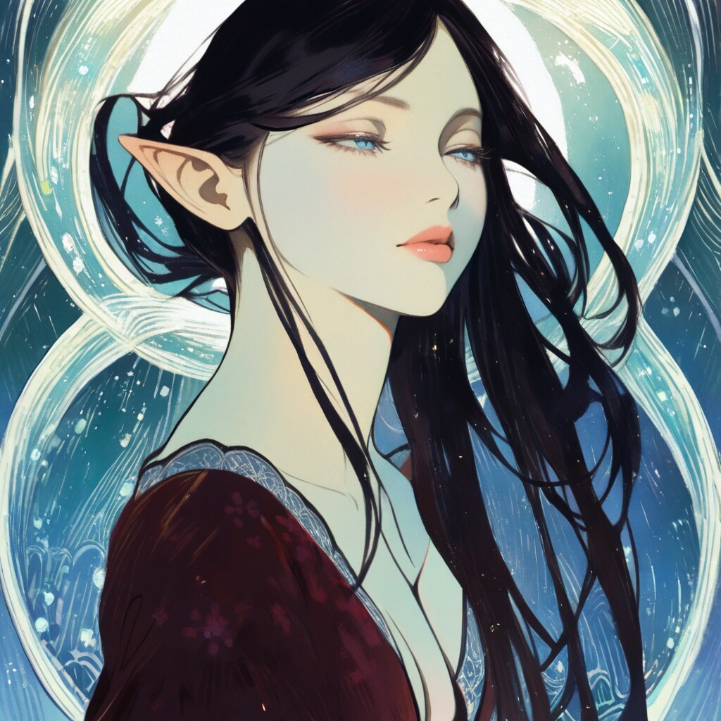 16 year old elf girl profile, black hair long hair, forehead, blue eyes, half-closed eyes, pointy ears, volume lip, cleavage breast, light silk lace cloth dark-red robe, expressionless, blue splash pattern background Mucha