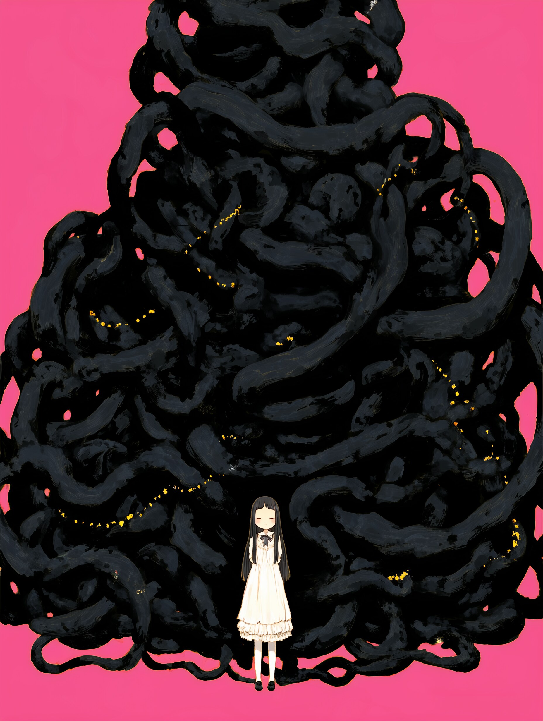 かわいく飾れました。 I was able to decorate it. * AIイラストレーター友の会向けに作ったイラストです。 This illustration was created for the AI Illustrators' Society. (Model) Midjourney V7 (Size) 1856 x 2464 pixels (Upscaler) Upscale (Subtle) by Midjourney (Last Seed) 1780692302 (i2i Count) 2 times / Whole conversion by subtle remix, Partial modification. (Manual Adjustment) - Prompt: empty, jet black, grotesque intestines, endless, huge creature, kawaii chibi idol --sref 1926612055::1 2175632912::1 951183652::1 2832889402::1 3628838409::3 --v 7.0 --ar 3:4 --s 150 --raw --sw 800 --weird 500 --p xd97txk