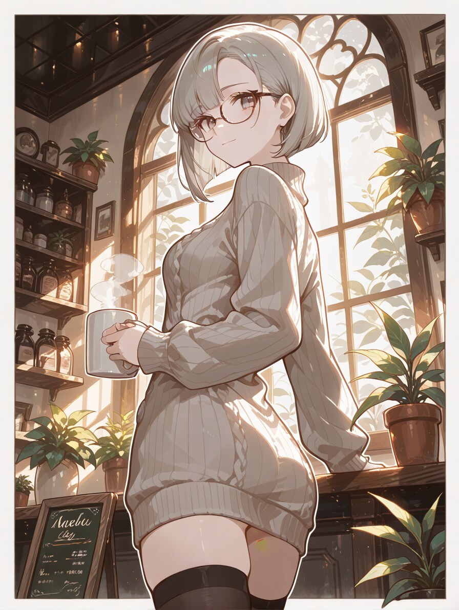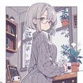 (glasses:1.2), light smile, looking back,