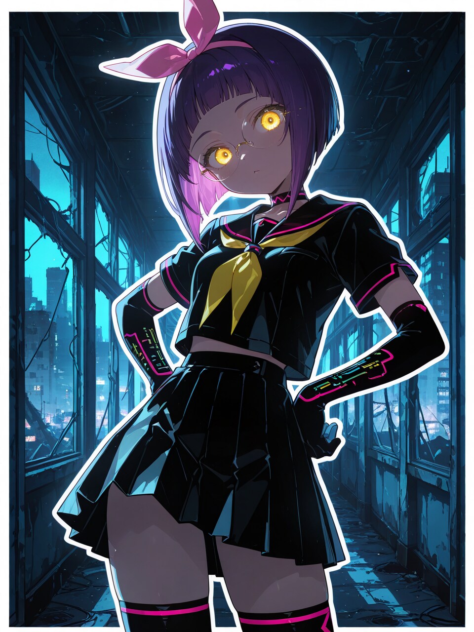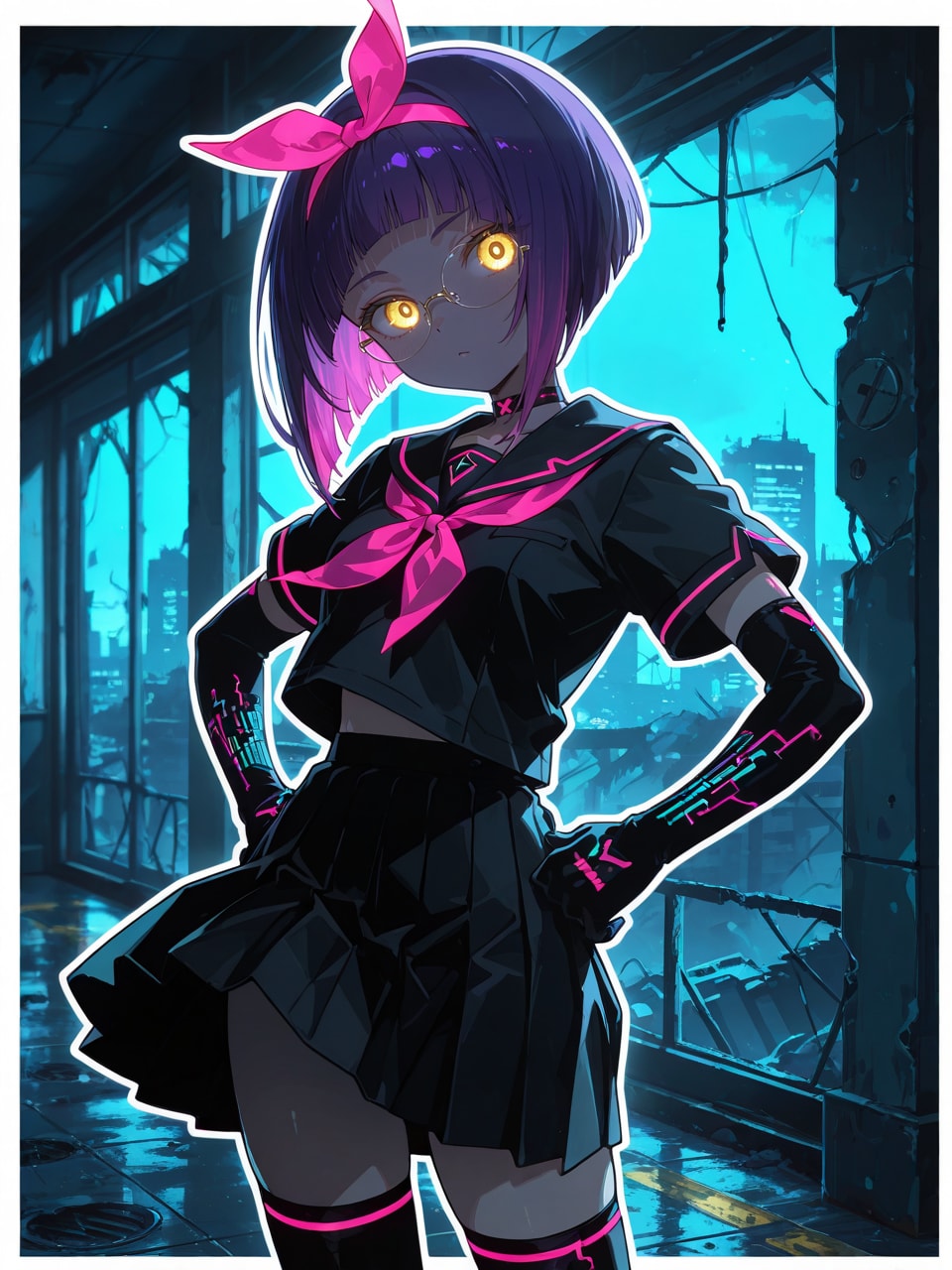 (circuit board print gloves:1.1), thighhighs, neon trim,