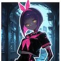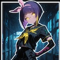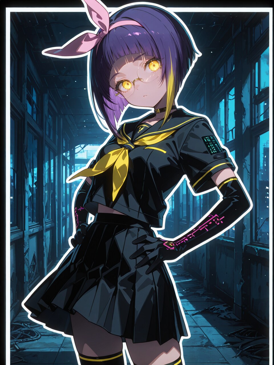 purple hair, inverted bob, (arched bangs:1.1), (two-tone hair:1.1), pink bow hairband, neckerchief,