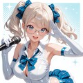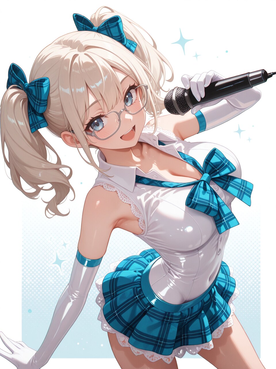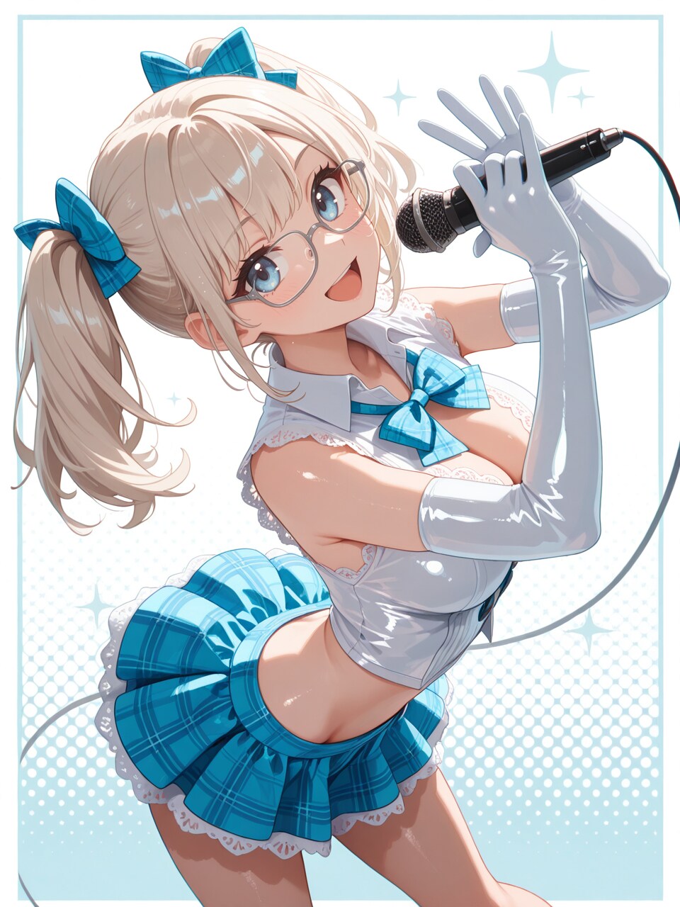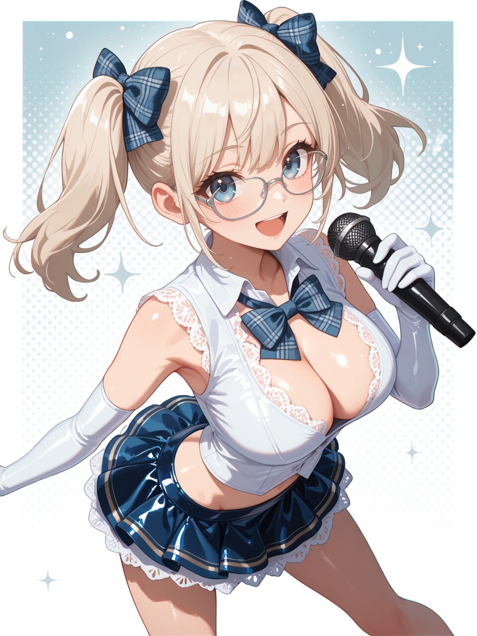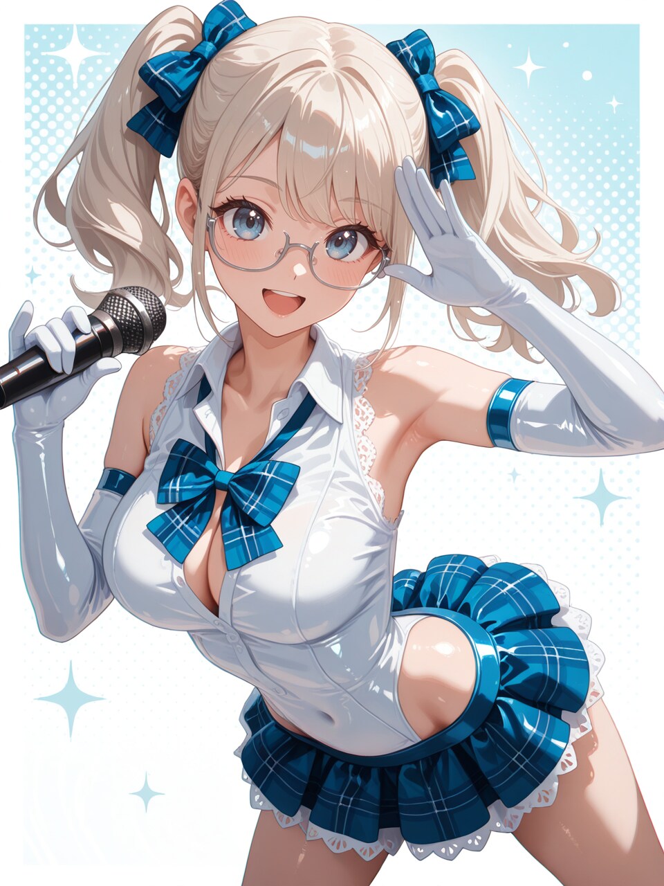 idol costume, white shirt, open collar, sleeveless, blue microskirt, (lace-trimmed clothes:1.1),