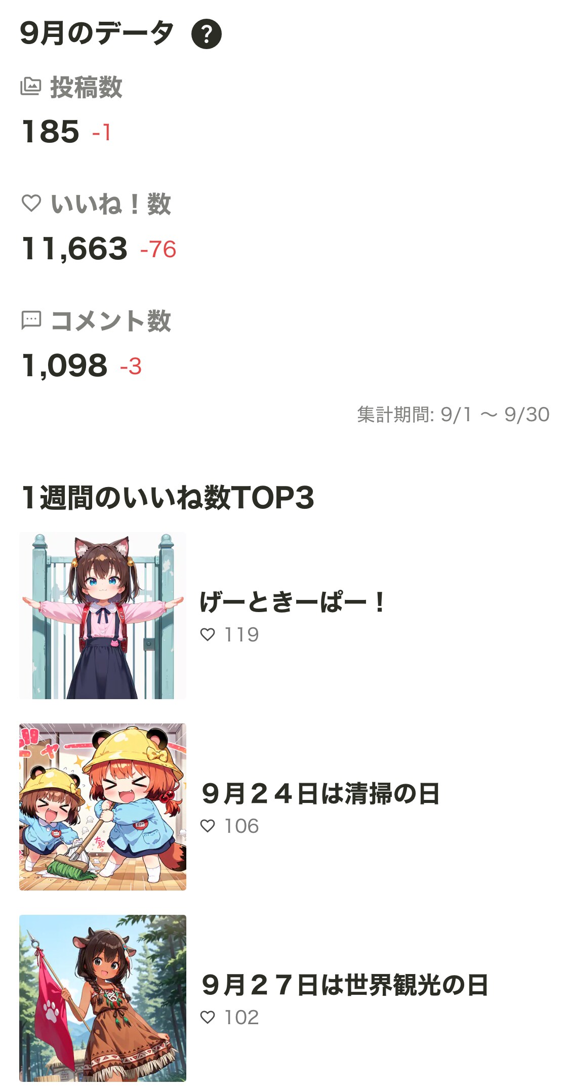 先月より1日少なかったですが、最終日に空欄吹き出し投稿企画でいっぱい投稿した分で挽回してる感じですね。