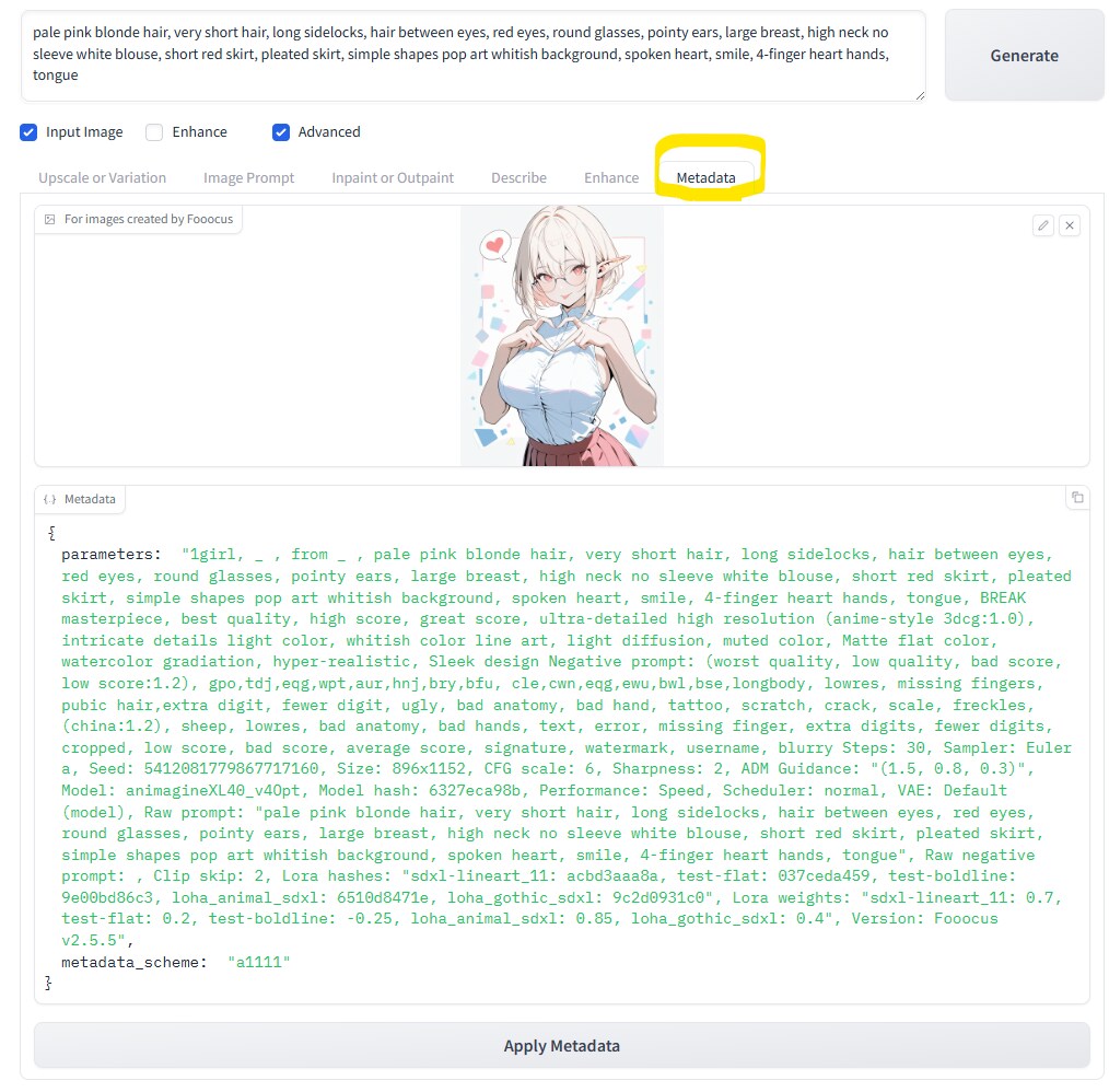 「For images created by Fooocus」の欄にメタデータを確認したい画像をドラッグ&ドロップすると、「Metadata」の欄に内容が表示されます。