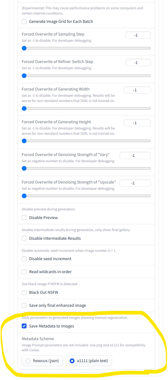 そうすると、Fooocusの設定項目がたくさん出てくる(5枚目)ので、それをぐっと下までスクロールしてください。一番下の設定項目(6枚目)として「Save Metadata to Image」があるのでそれをオンにしてください。