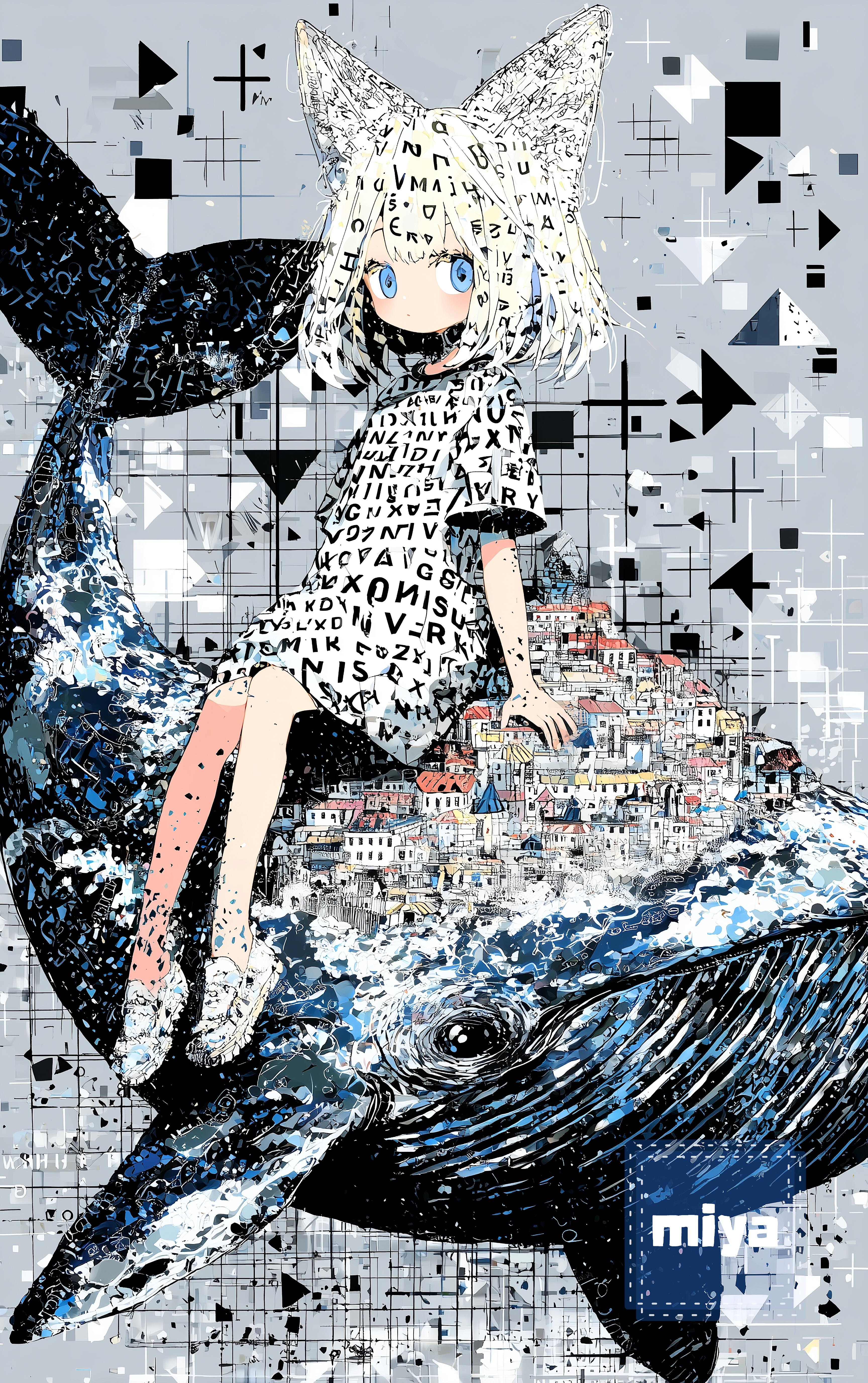 picture book style kawaii chibi anime, art nouveau, white frame surrounding the entire area, dynamic tilt angles from side, asymmetrical composition, close-up fox girl, whale melting with marbling pattern, floating medieval town built on back of whale, fox ears, fluffy tail, sun dress, geometric arrows, barefoot, layers upon layers, water's surface made entirely of small lots of large and small letters in decorative fonts, thinking bubbles, long-exposure photograph, light trail, summer sunset --v 7.0 --raw --p xd97txk --sref 1970097021::1 3161817471::1 3604182537::3 568688171::5 3544290919::1 3710016932::1 2494083273::6 3717843000::2 1702533951::2 602153393::3 2220609054::3 418458060::2 2895306335::2 --sv 4 --sw 300 --exp 25 --ar 5:8 --s 325
