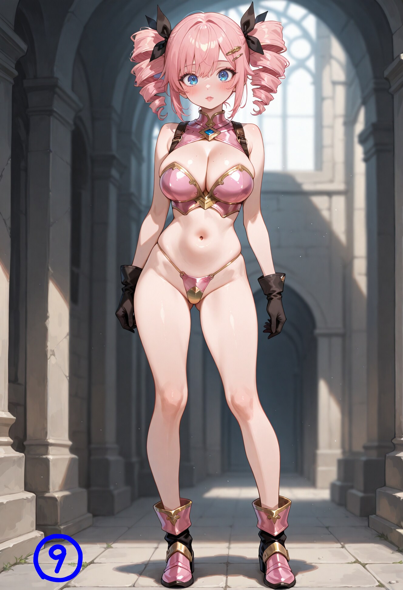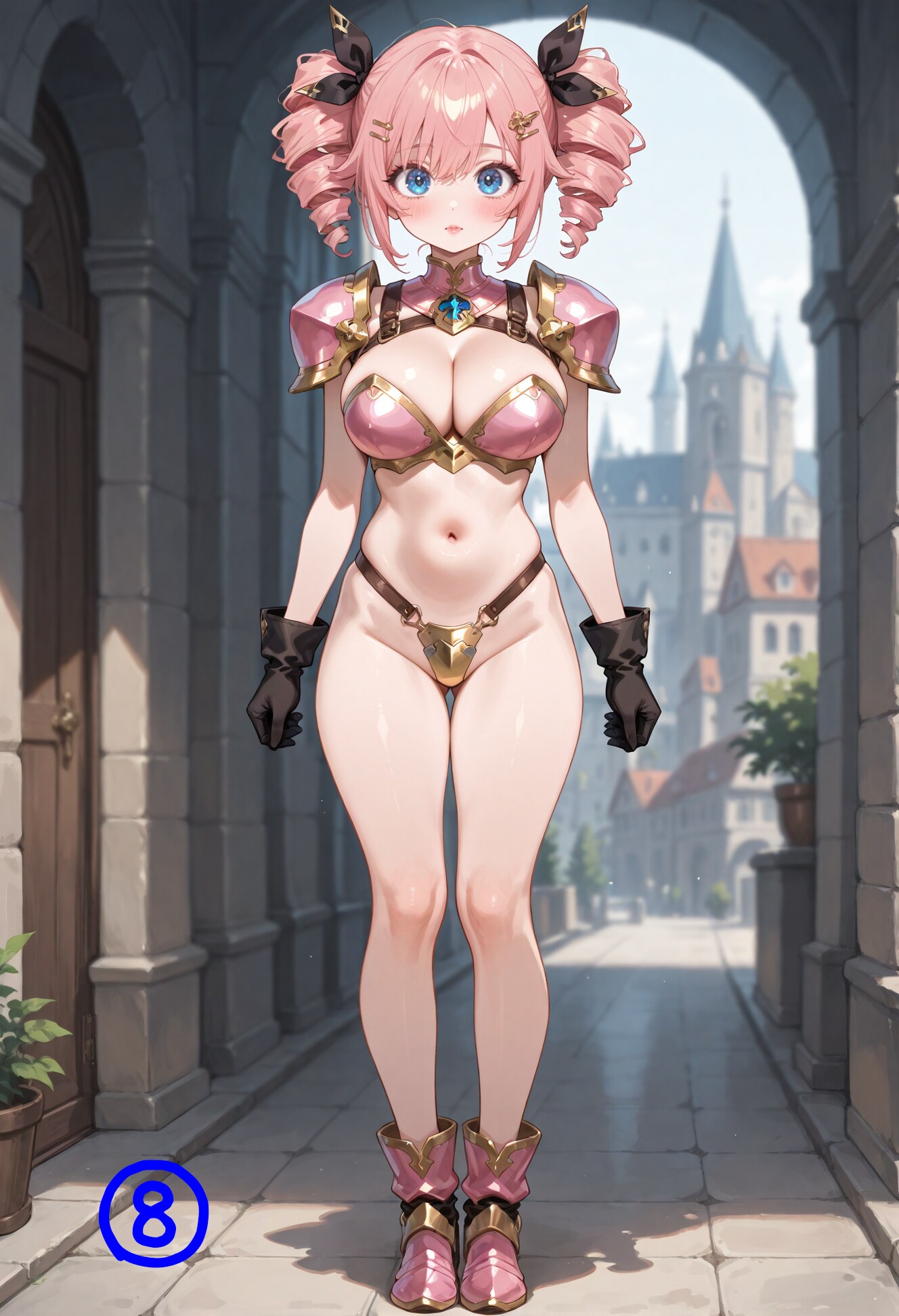 🧠【雑談】:ビキニアーマー ※あくまで私個人の意見ですので異論はご自由にどうぞ。 ✅『個人的なビキニアーマーの定義』 個人的なビキニアーマーの定義としては、古い作品だと『幻夢戦記レダ』や『ドリームハンター麗夢』あたりでしょうか。 SNKのアテナなどもそれっぽぃですが、見た感じにあまり金属感が無いのでアーマーかと言われると・・・。 ビキニアーマーキャラとして名前を挙げる時には出さないですが、ビキニアーマーキャラかと聞かれたらギリギリ範囲内と答える感じでしょうか。 その一方で、同じく名前がよく挙がる『夢幻戦士ヴァリス』とか『ドラクエの女戦士』などはちょっとビキニアーマー外の認識です。 夢幻戦士ヴァリスの麻生優子は、上は良いのですが下はスカートですからちょっと違うかなと。 ドラクエの女戦士は何が気になるのかというと、『前垂れ』です。 確かに露出が多くてビキニ感はあるのですが、前垂れはちょっとごめんなさいという感じなのです。 ①:メインで投稿しているビキニアーマーのツインドリルちゃん ぱんつはもう少し大きくても良いです。(※マイクロはただの好み。 スカートおよび前垂れは付けたくない派。 ②:前垂れはちょっと違う感・・・ ③:『tasset(タセット)』(※太ももの上部を保護するための腰鎧)は、出来れば無い方が良いですが、小さいモノなら可。 🌱【腕、脚、肩の鎧】 胴体部分は守れてない感満載ですが、腕と脚はそれなりに鎧がある方が好きです。 また、肩鎧は基本的に付けたいです。 首回りはあまりこだわりが無くてインナーでもストラップでも良い感じですね。 ブラとぱんつの要件さえ満たせばあとはわりと自由だったりします。 ぱんつに関してはデザインが安定しないので、金属感があればokということにしています。 ✅『脚の鎧』 脚部は基本的に太ももの半分くらいまで覆うサイブーツが好みです。 胴は守れてなくても腕と脚をしっかりしておくとそれなりに戦士感が出るので好きです。 ブーツに関しては膝下や踝までのショートブーツも悪くありません。 ④:ニーブーツくらいまでなら腕はそのままでも良いかなという感じ。 ⑤:アンクルブーツまで来ると腕の露出を増やしたい。 サイブーツより短くするならアンクルブーツまで短くした方が好きですね。 ただし、脚の露出が増えるのでこの場合は腕の露出も増やします。 それと、重要なのがヒールです。 基本的に女性キャラにはヒールを付けたい派です。 ⑥:ヒールの高さはこれくらいが上限。これ以上高いとちょっと微妙・・・。 普段はheel bootsで指定しているのでもう少し低め。 太さもこれくらいか、もう少し太いくらいが好み。 ピンヒールのような細いのはNG。 ✅『腕の鎧』 ショートブーツにした場合は、インナーを着けずに腕の肌が見えるようにしたいですね。 このへんは見た感じのバランスです。 軽装Ver.という見た目はこれはこれで全然ありです。 ⑦:短いガントレット タセットも付けてみましたが、わりとバランスが良くてイイ感じです。 ⑧:グローブにする場合は布製が好み。 ✅『肩の鎧』 ショルダーを外すとさらに軽装になってリラックスVer.という感じでしょうか。 ビキニアーマーではありつつも鎧感がほとんどなくなってしまいますね。 出来れば丸いショルダーパッドが良いのですが、多少角張っているくらいならokです。 トゲ付きは・・・ちょっと・・・。 ⑨:ショルダーパッド無し ✅『何かに似ていると思ったら・・・』 ビキニアーマーのイラストを作っていて何かに似ていると思っていたら、逆バニーですね。 あまり逆バニーは好みではないのですが、ビキニアーマーに似ていると思うと意外と悪くない感じはしますね。 ⑩:逆バニー 💡『後記』 短めですが今回は雑談1回目ということで『ビキニアーマー』について語ってみました。 体を守る鎧なのに守れていないという突っ込みでお馴染みですが、この独特のえちち感はたまりません。 細かく見ていくと自分でも気づかなかった意外なこだわりが見えて来ました。 ファンタジー物の女戦士枠には欠かせない感じがします。 説明用にお試しで色々作っていたらこういうのもイイナァというのがいくつかありました。 前垂れはビキニアーマーとしては微妙ですが、これはこれで別の衣装に使ってみたくなりました。 短くするとそれはそれでえちちな感じになって良きなので機会があれば使ってみたいですね。 ⑪:短い前垂れ # Model: shiitakeMix v2.0 by Vsukiyaki 【ビキニアーマーの少女】 ビキニアーマーの少女 ※R-15 https://www.chichi-pui.com/posts/76eafe27-8082-403e-9dac-6ab00f72a356/ ビキニアーマーの少女2 ※R-18 https://www.chichi-pui.com/posts/b6685244-1ff8-4c53-9569-8b6c2bad01fb/ ビキニアーマーの少女3 ※R-18 https://www.chichi-pui.com/posts/bee05c5f-9008-4156-9bf8-5d012efc5f30/ ビキニアーマーの少女4 ※R-18 https://www.chichi-pui.com/posts/cd8cf2b1-8eb3-4bd1-a9d4-90874e34147a/ ビキニアーマーの少女5 ※R-18 https://www.chichi-pui.com/posts/b8a918cb-ed6d-4b88-b300-22ff9c6929e3/ ビキニ