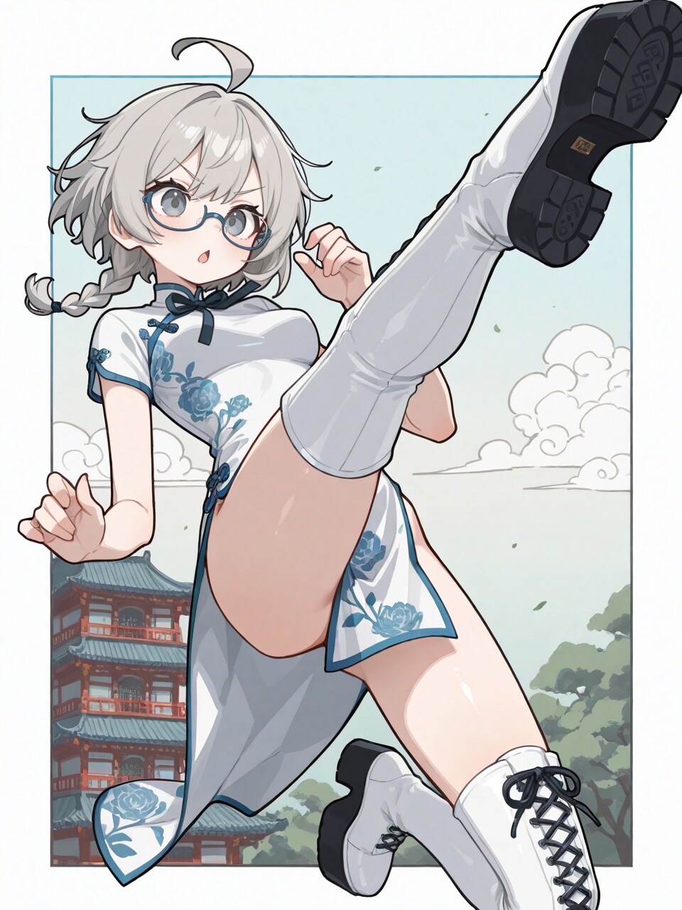 1girl, (skinny:1.1), jumping, (flying kick:1.4), fighting stance,