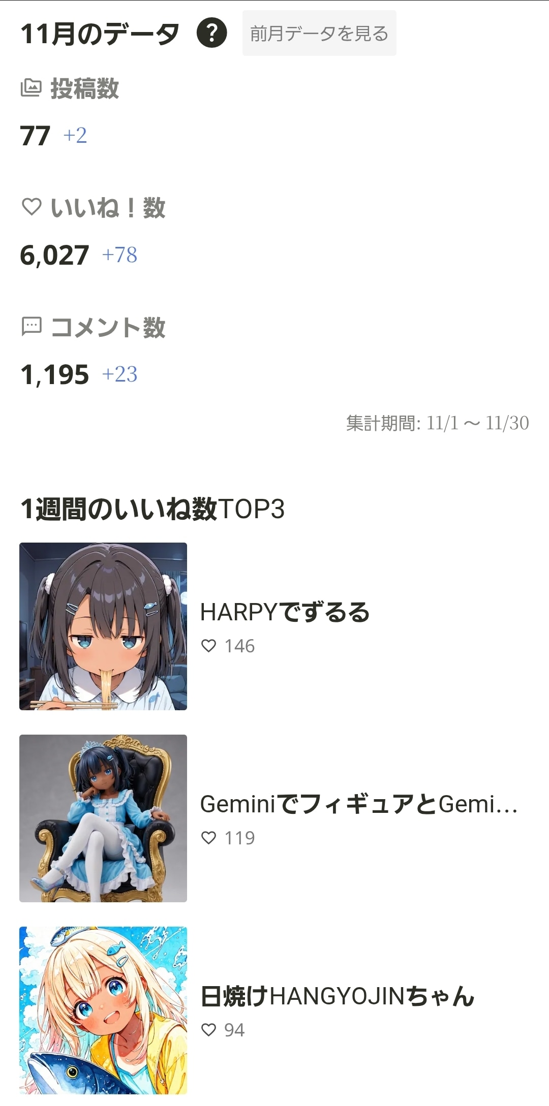 先月ミラさんの真似で、引き続き10月分もやってみました! と思ったら、画像上中央に『前月のデータを見る』 のボタンが増えてる!!( ゚∀゚) 1か月前のデータはササッと確認出来るようになったのですね!✨ キャプション編集してて気が付きましたw 10月は40000いいね突破の投稿もあって9月よりも投稿数といいねは少し減りましたが、コメント数が増えてますね!✨ 改めて皆様ありがとうございました🥰 9月の実績 https://membership.chichi-pui.com/posts/images/e4a8e1da-29db-4529-8c8e-c65168c64b8f/