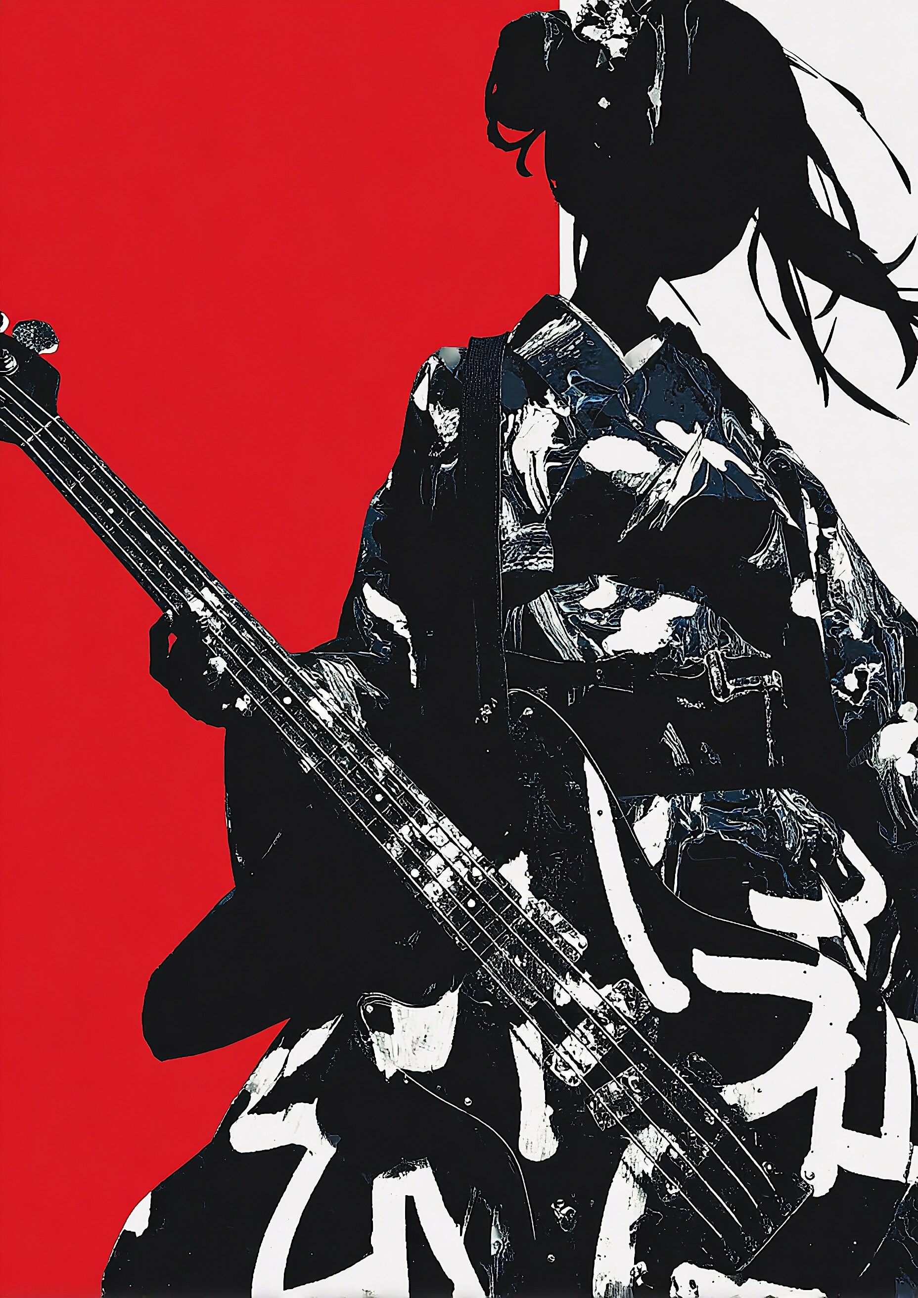 extremely bold slash composition, unconventional dynamic angles from diagonal below, 8 arms, close-up, picture book style psychedelic portrait, op art, moe anime, kawaii saraswati, violently playing a biwa in the shape of an bizarre electric bass, long hair, queue, marbling, triangle mountain, kanji background, vibrant red solid paint, upper body, dramatic epic pose, limited palette, ephemeral, beautiful aesthetics, mandala, kimono --v 7.0 --raw --p xd97txk --sref 2818209576::3 2433307804::1 1926612055::3 2175632912::3 1817225359::3 2832889402::1 --sw 500 --exp 10 --ar 5:7 --weird 100 --s 500