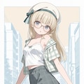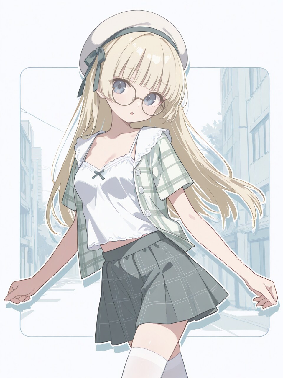 white beret, (green plaid open shirt:1.1), short sleeves, white camisole,