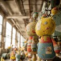 many kawaii chibi hand-knitted dolls are being mass-produced in an abandoned factory, conveyor belt, press machine, picture book style dmt art, optical illusion, ben day dots, indoor of abandoned factory, ooze, messy cut and paste, grattage, quadrangle reminiscent of urban legends, two tone colors, pop and dark, geometric, elaborate writing, limited palette, dynamic angles, exquisitely detailed, ultra-detailed, absurdres, highres --v 7.0 --p 7tzz4db --ar 3:4