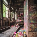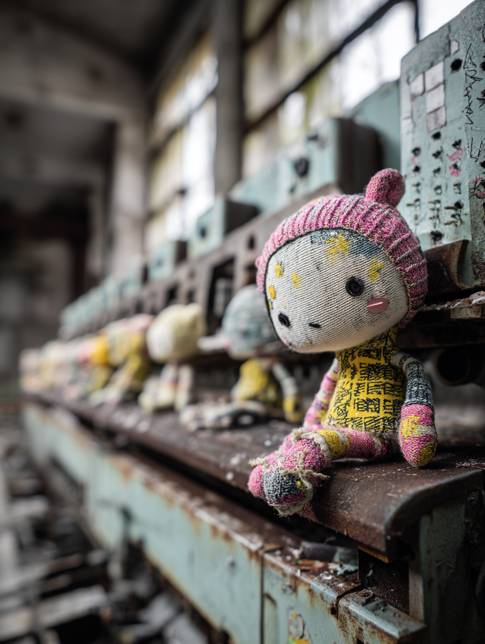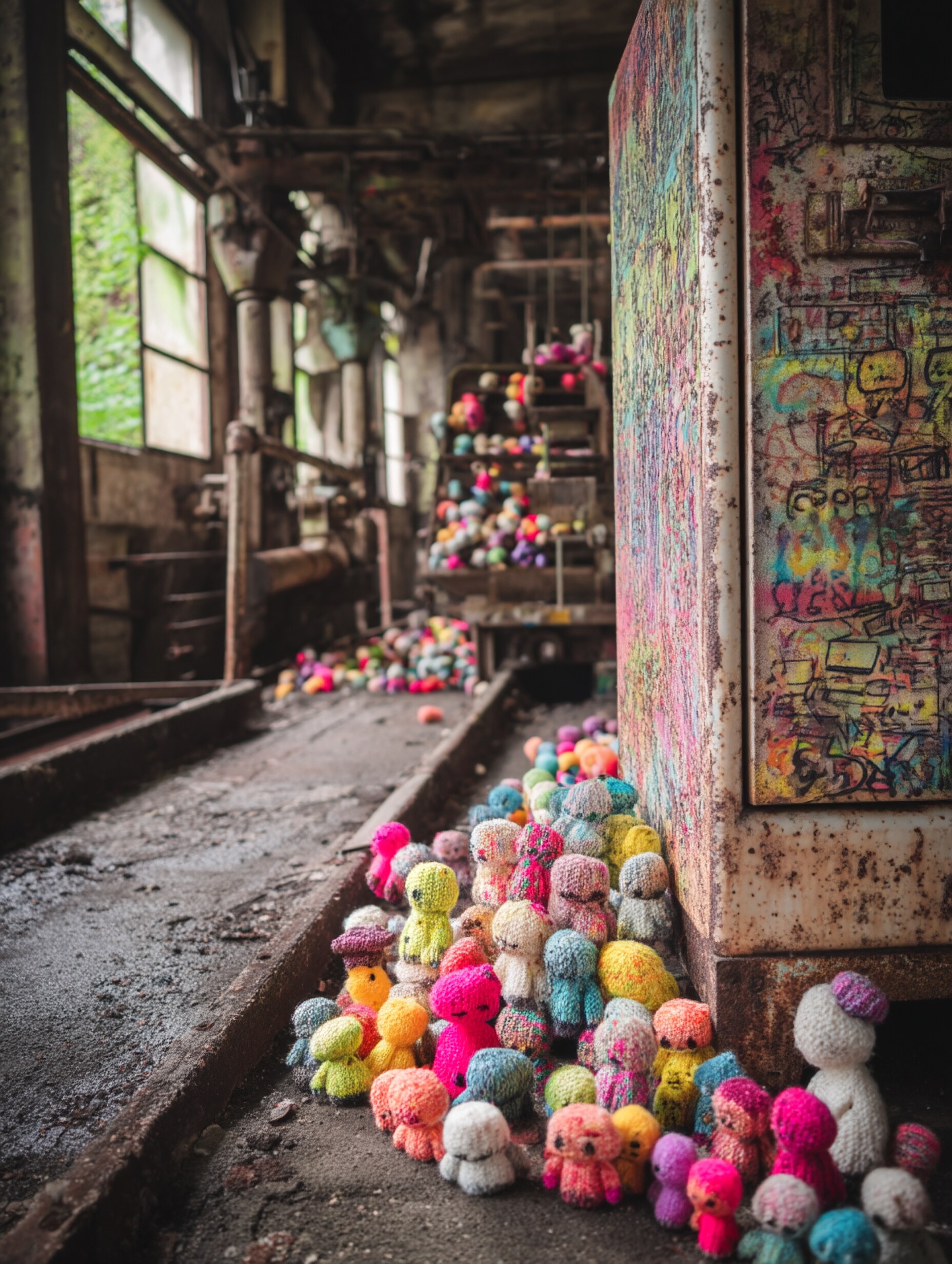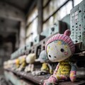 many kawaii hand-knitted dolls are being mass-produced in an abandoned factory, run away dolls held by the arm of a crane game machine, crane game, grass and trees are thriving, conveyor belt, press machine, picture book style dmt art, optical illusion, minimal illustration, indoor of abandoned factory, ooze, messy cut and paste, grattage, quadrangle reminiscent of urban legends, two tone colors, pop and dark, geometric, elaborate writing, limited palette, dynamic angles, exquisitely detailed, ultra-detailed, absurdres, highres --v 7.0 --p 7tzz4db --ar 3:4 --s 130