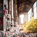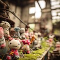 many kawaii hand-knitted dolls are being mass-produced in an abandoned factory, crane game, grass and trees are thriving, conveyor belt, press machine, picture book style dmt art, optical illusion, minimal illustration, indoor of abandoned factory, ooze, messy cut and paste, grattage, quadrangle reminiscent of urban legends, two tone colors, pop and dark, geometric, elaborate writing, limited palette, dynamic angles, exquisitely detailed, ultra-detailed, absurdres, highres --v 7.0 --p 7tzz4db --ar 3:4