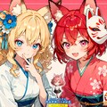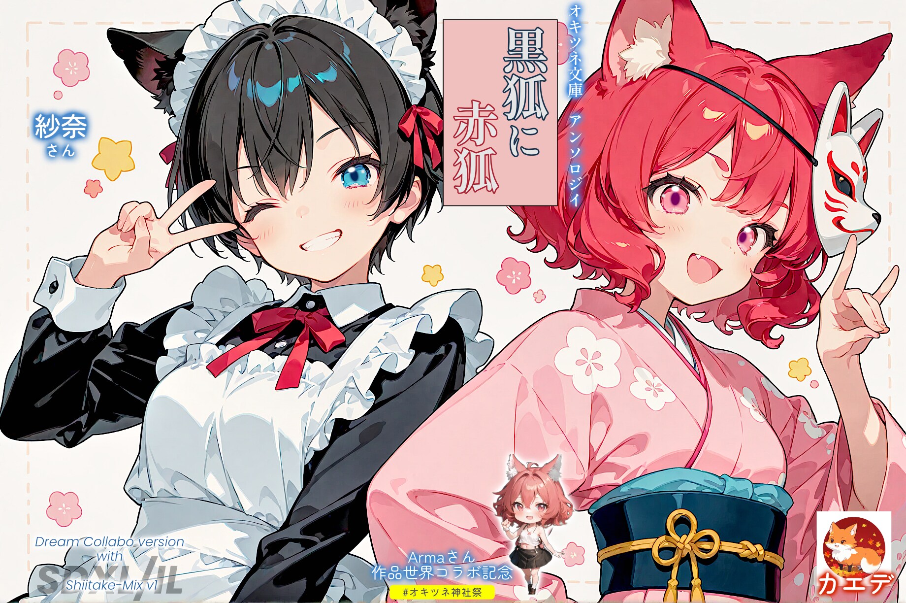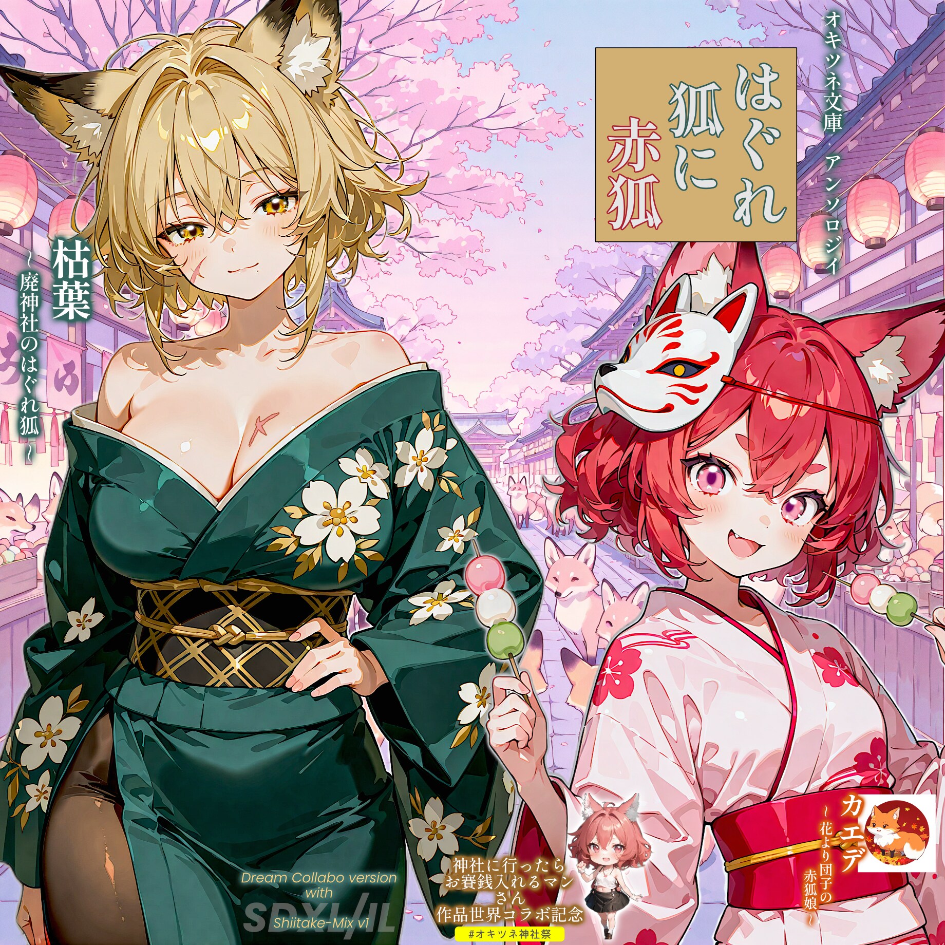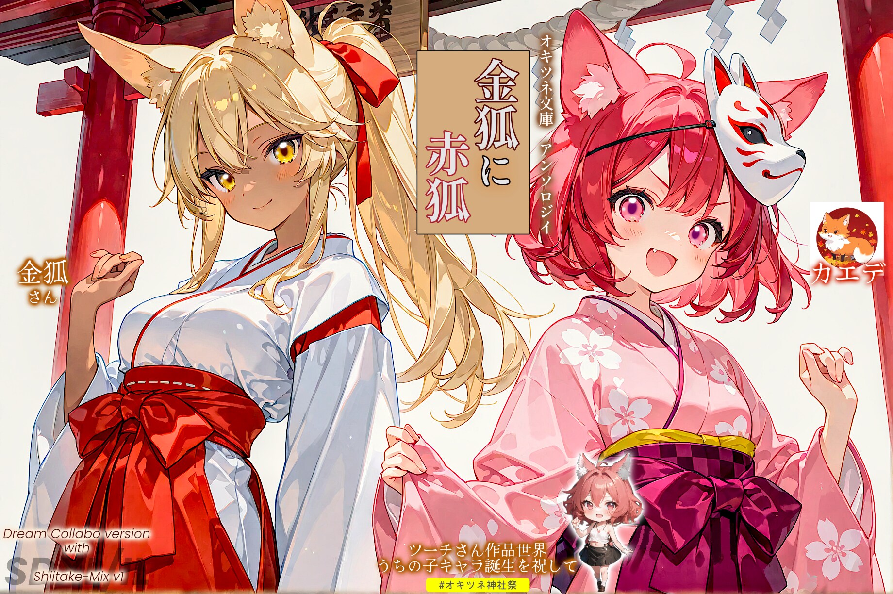 お賽銭を入れたくなる不思議World!「神社に行ったらお賽銭入れるマン」さんの大人キャラ、「廃神社のはぐれ狐」シリーズの「枯葉」(こよう)様とうちのカエデです。