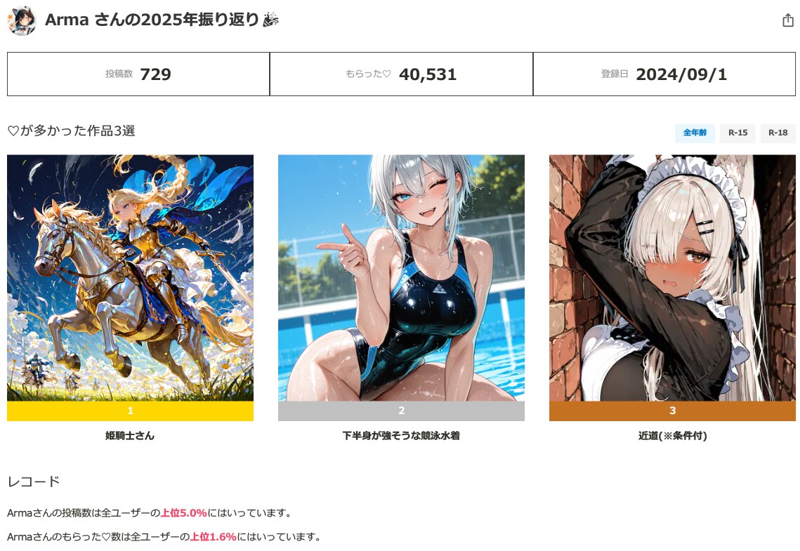 あけましておめでとうございます 短評 年末恒例の振り返り画面が見れますね。2024年の9月から始めたので今回がほんとの1年の振り返りになります。 正直トップ3がこれなんだぁ…みたいな感想です。 まあ時の運というか偶然伸びたみたいな感じもあると思うのであんまり気にしないほうが良いんでしょうね。 ちなみにR15に至っては、全年齢で上げたやつが飛ばされてきたやつが全部です。お前いい加減にしろよ。 こんなことをやっていてはいつか消されてもおかしくありませんよ。 一応、来年の振り返り用に全部のトップ3の画像とリンク書いときます。年齢ごとに分けるのもめんどくさいしモザイク強めやし大丈夫やろ… 全年齢 https://www.chichi-pui.com/posts/4ae59ec4-4220-4b81-b735-d2964c1b685e/ https://www.chichi-pui.com/posts/9436f9e6-2a9e-42ed-a92a-4a55634e5ada/ https://www.chichi-pui.com/posts/3b5d17a7-4825-4fbe-b493-9ffcd0d02c4f/ R-15 https://www.chichi-pui.com/posts/add59071-2c34-4e82-aa71-fa774e53cffd/ https://www.chichi-pui.com/posts/adc8c155-148f-49be-89b2-c1434cfdb12e/ https://www.chichi-pui.com/posts/bb1ea5e8-e43e-4cea-ad04-df70afe3d034/ R-18 https://www.chichi-pui.com/posts/0f5ac0b2-e055-4980-a83f-f2bcf6e73c5c/ https://www.chichi-pui.com/posts/329049cc-5943-4a02-8ad7-beb9edb37f4d/ https://www.chichi-pui.com/posts/667bc439-4ecd-42d8-a866-92b492f20cf0/ 100いいね超え作品 2025/12/16 おまたせ~ https://www.chichi-pui.com/posts/07196792-9202-4c99-bc92-332e0a567294/ 2025/12/26 ルーキー応援イラスト https://www.chichi-pui.com/posts/85e816e6-061d-4112-a03a-ca7280d8a320/